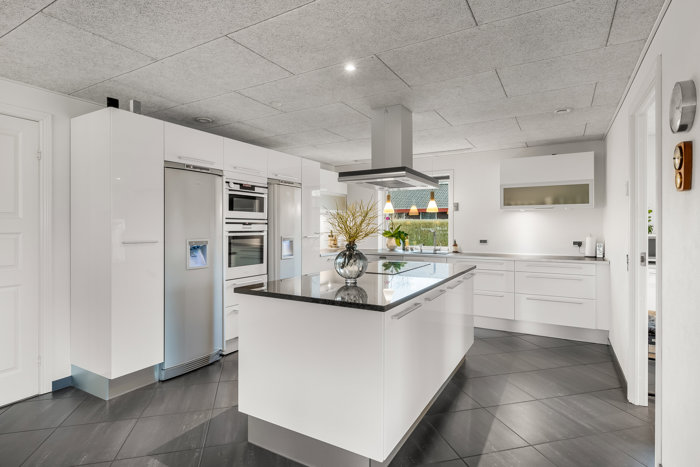 Herfra ledes man videre ind i husets hjerte - det store, lyse køkkenalrum og med stue i åben forbindelse. Fra stuen er der udgang til den overdækket terrasse, hvor sommeren kan nydes i læ og ro.