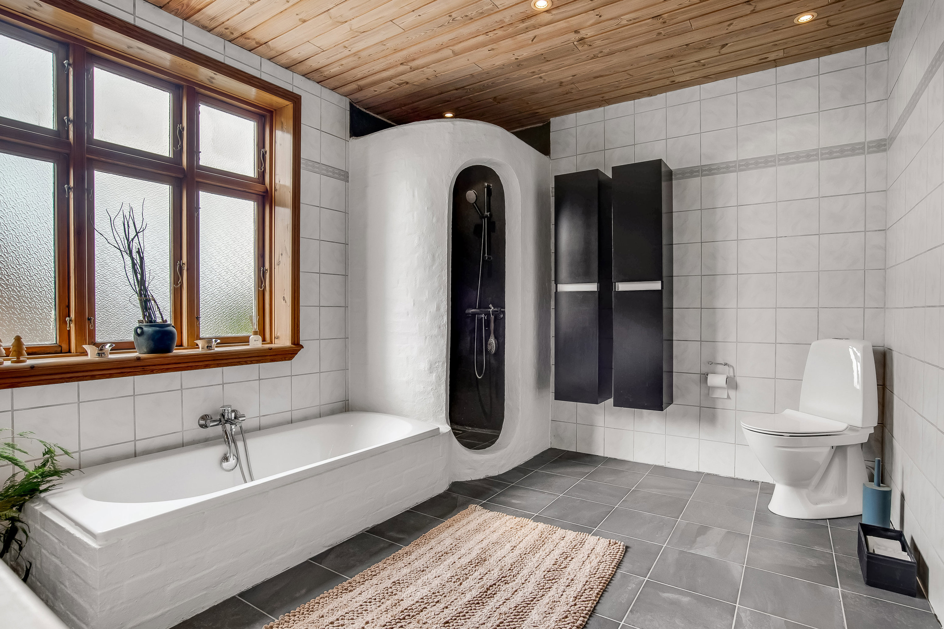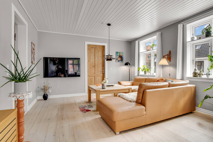 Indendørs venter 166 m² bolig, der er gennemført med øje for både rummelighed, lysindfald og dagligdagens behov. Huset fordeler sig over to plan, hvilket giver rig mulighed for at skabe individuelle rum til både børn, gæster, kontor eller hobby. I stueplan mødes man af et stilfuldt køkken i toner, der står flot til de lyse trægulve og hvide lofter. Køkkenet er integreret med spiseplads og god forbindelse til opholdsstue, hvor store vinduespartier sørger for et behageligt lysindfald. Stuen er perfekt til både hverdag og gæster – rummelig uden at miste hyggen. Badeværelset på denne etage er stort og lækkert med både karbad, muret bruseniche og gulvvarme – alt sammen udført i kvalitetsmaterialer og med sans for detaljer.