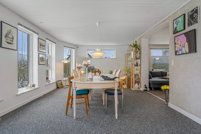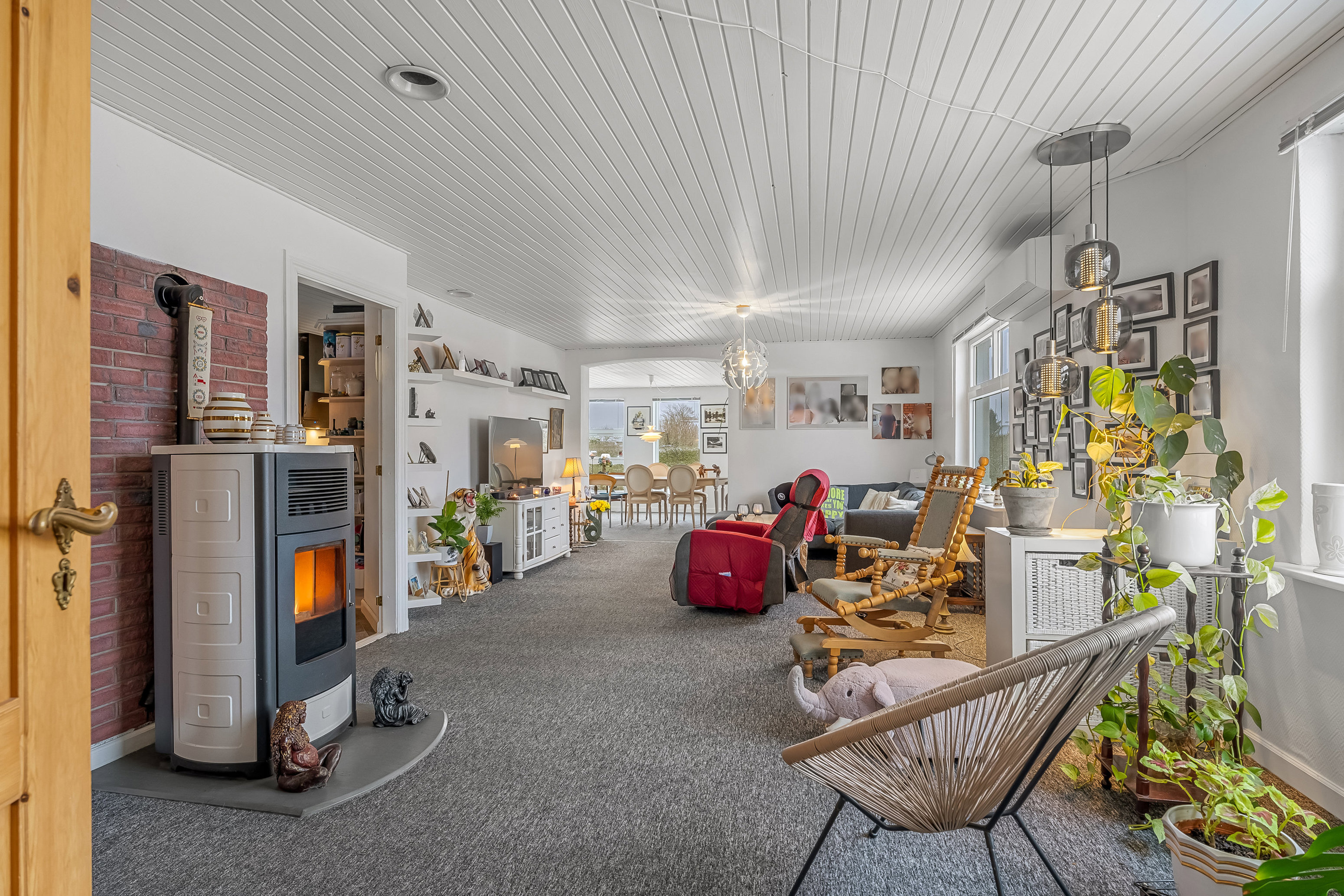 Rummelig opholdsstue med pilleovn og varmepumpe. Skøn udestue/spisestue med store vinduespartier og et behageligt lysindfald, fungerer som ekstra opholdsrum med udsigt til haven.