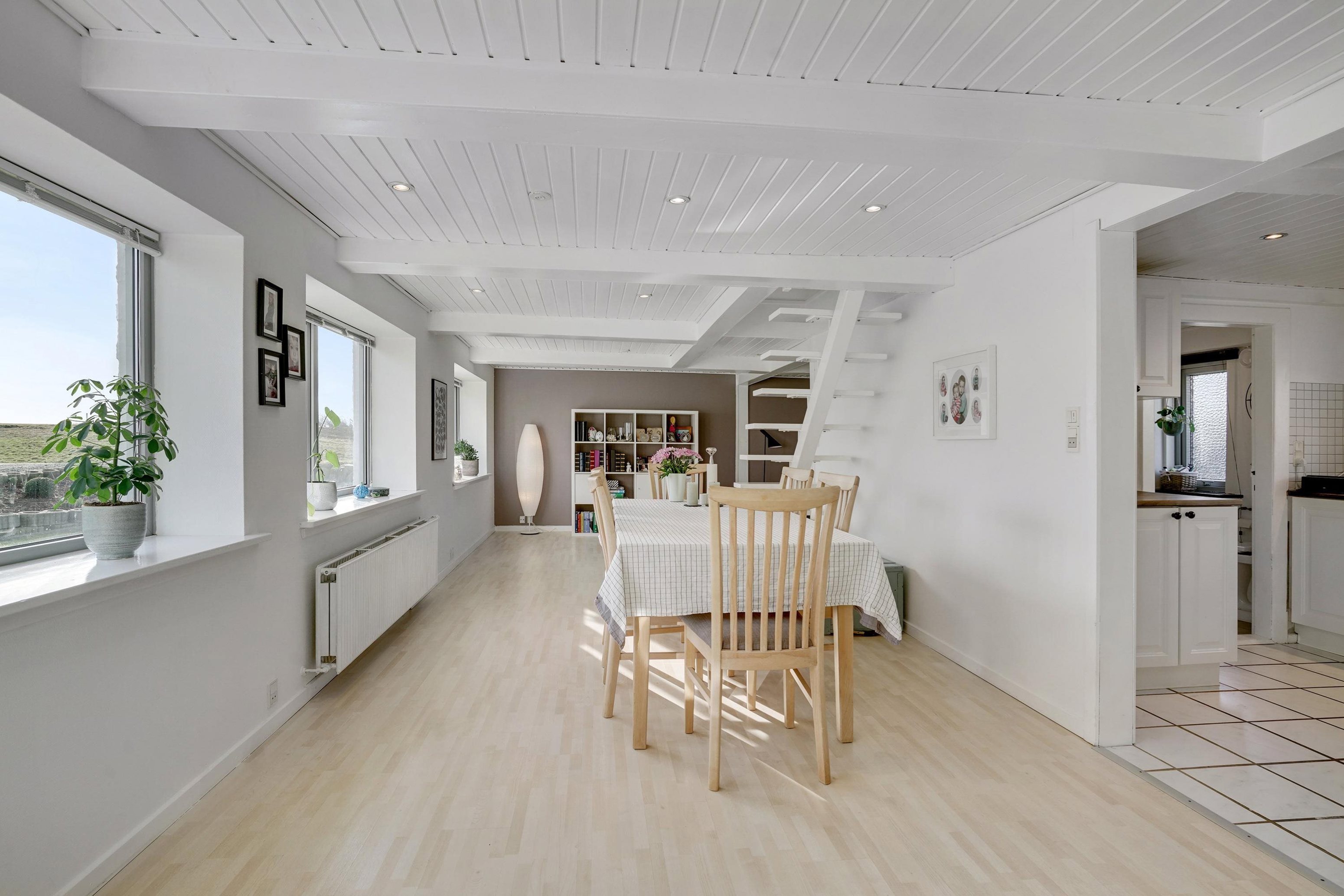 Køkkenet er praktisk indrettet med god bordplads og ligger i åben forbindelse med stuen, så man altid er en del af samværet. I forlængelse heraf findes et rummeligt bryggers med egen indgang – ideelt til hverdagens gøremål. Stueplan rummer desuden et ekstra disponibelt rum, som kan anvendes som kontor, gæsteværelse eller børneværelse, samt et badeværelse placeret centralt i boligen.
