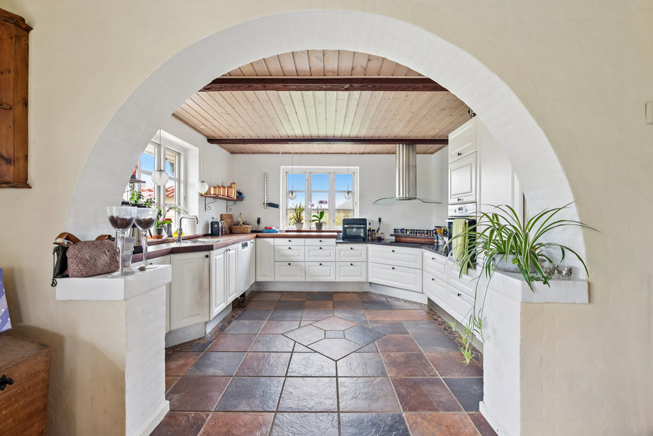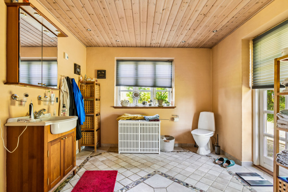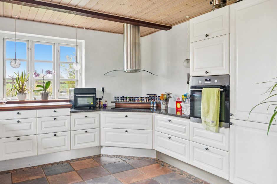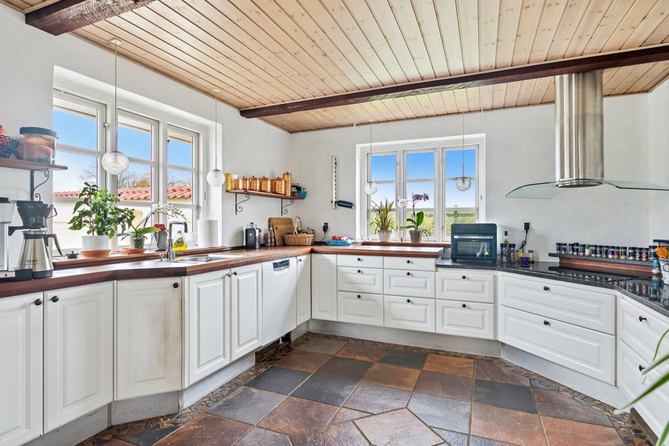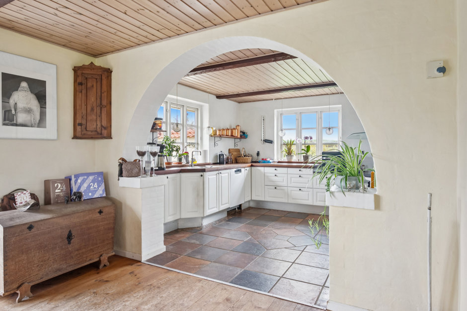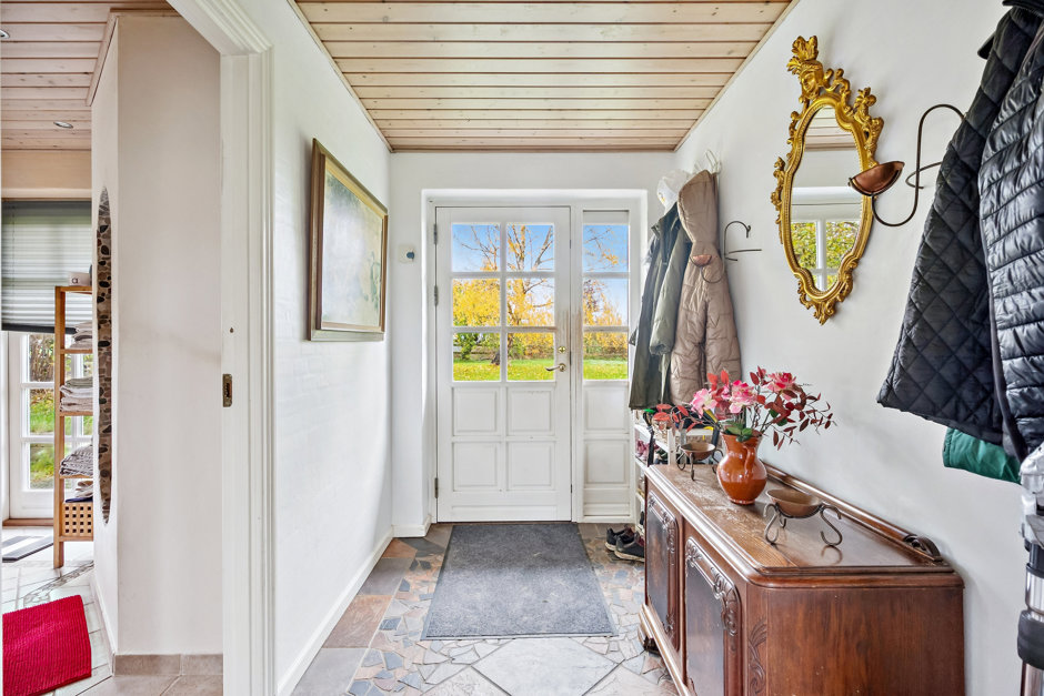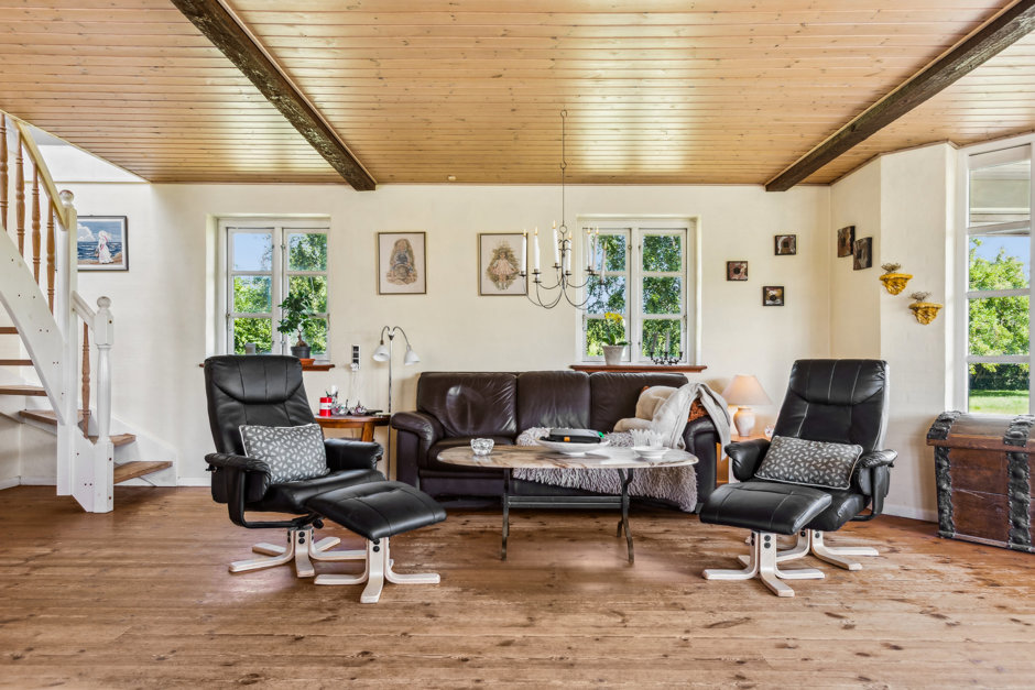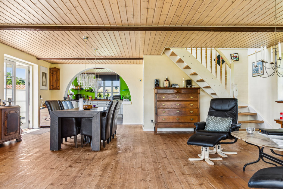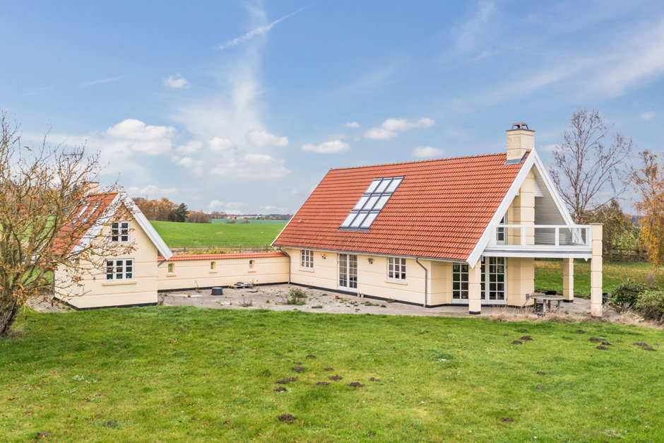 Boligen er lys, venlig og funktionel med et stort, åbent køkken-alrum og opholdsstue i direkte forbindelse. De store vinduespartier trækker naturen helt ind og giver adgang til en solrig fliseterrasse og den frodige have. På førstesalen finder du tre værelser, hvoraf det ene har udgang til en hyggelig træterrasse med udsigt over de omkringliggende marker. En repos med loft til kip og ovenlys skaber både luft og lys – og en rolig atmosfære, der gør hverdagen let at holde af.