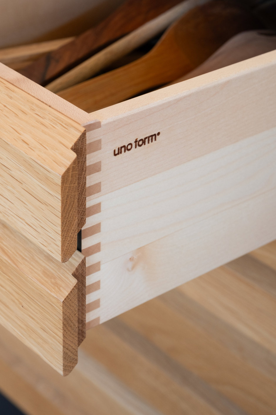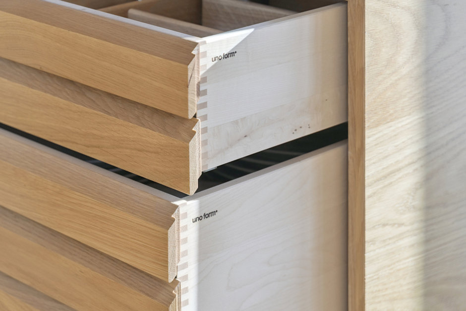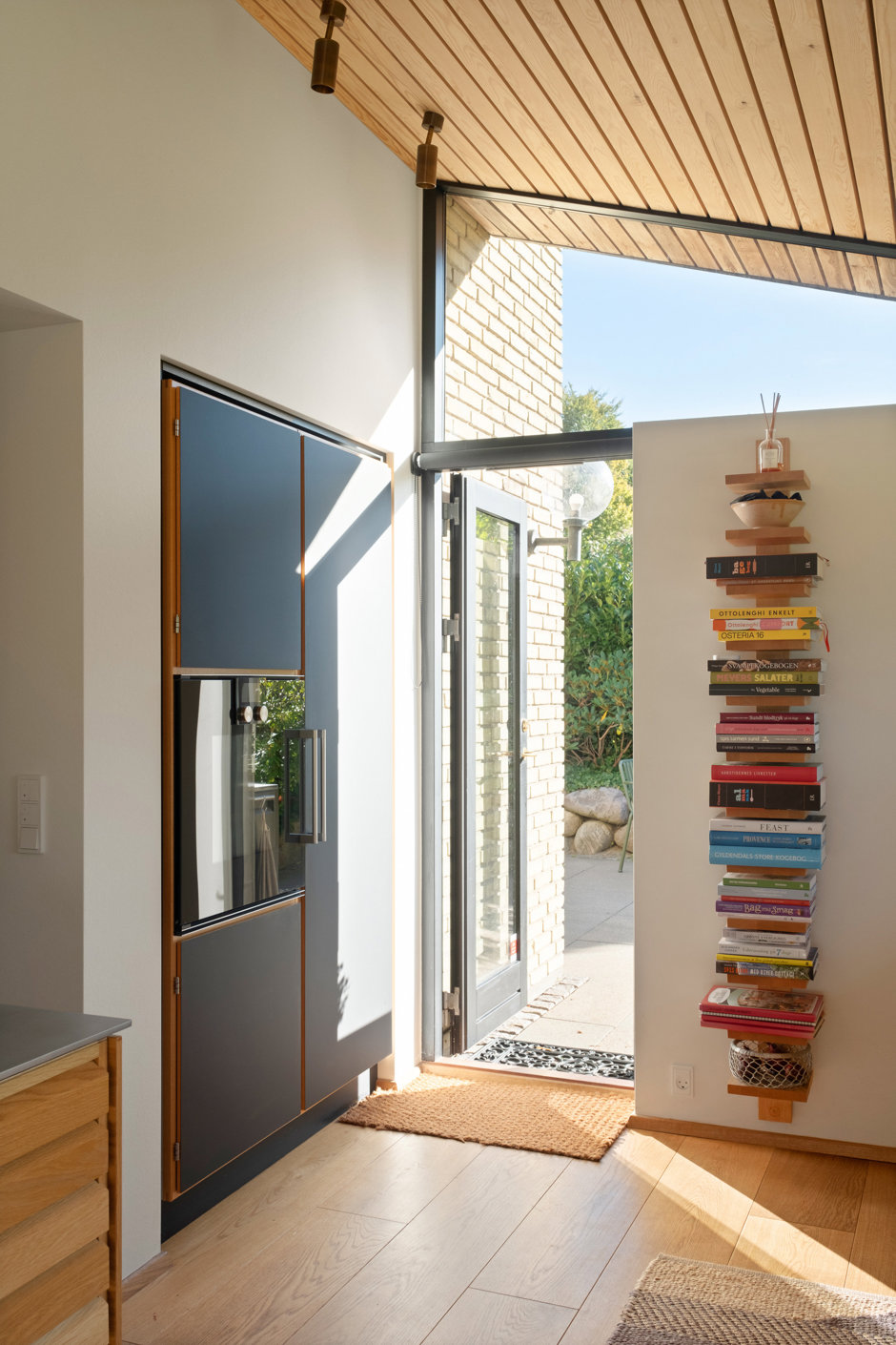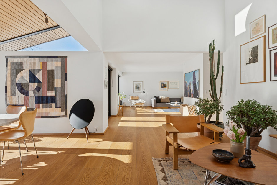 Boligens hjerte er det åbne køkken-alrum med store glaspartier mod haven. Køkkenet fra UNOFORM i eg med massiv stålbordplade er både funktionelt og æstetisk. Herfra er der naturlig forbindelse til stuen med loft til kip og ovenlys, hvor lyset strømmer ind og skaber en let og behagelig atmosfære.