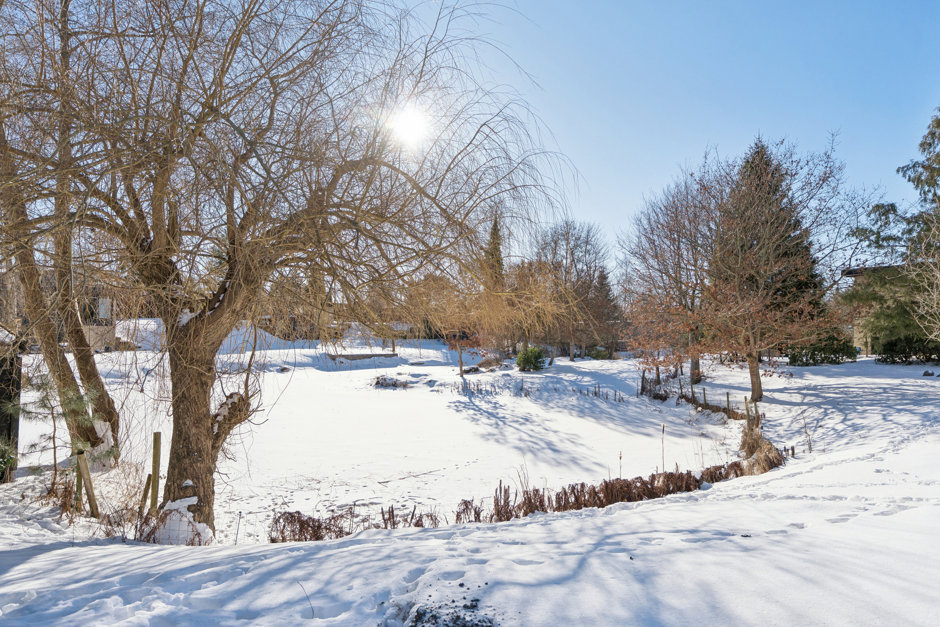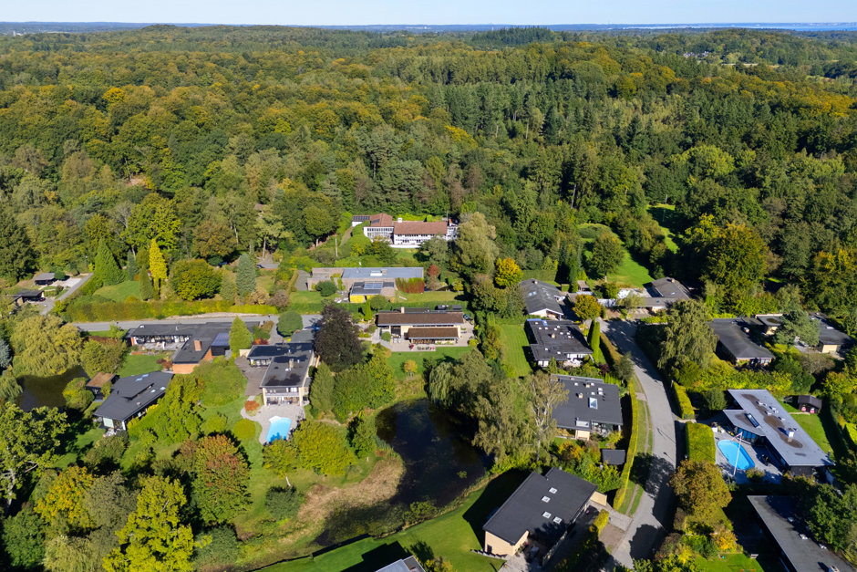 Grunden på 1.950 m² er solrigt orienteret og smukt anlagt med parklignende have og egen sø. Fra haven er der direkte adgang til skoven, og naturen bliver en del af hverdagen året rundt. Her kan solen følges fra morgen til aften, og roen sænker sig helt naturligt, når dagen går på hæld.