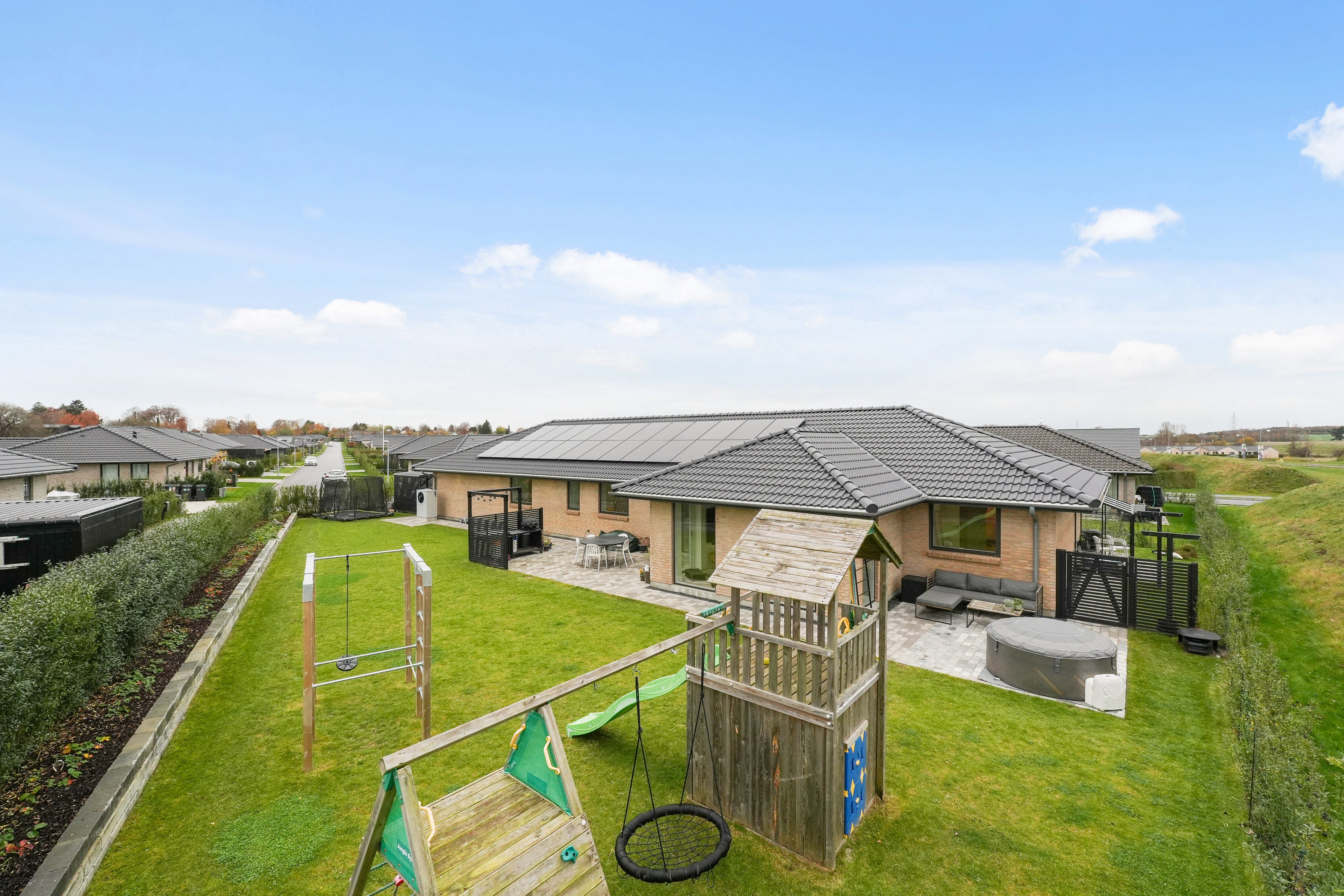 Når de ydre omstændigheder er i orden, er det også lettere at sætte pris på selve boligen. Lyse murstensfacader og et valmtag med bredt udhæng efterlader et kvalitetsbevidst indtryk, og herregårdsstenene er anlagt med flisegang hele vejen rundt om huset. På solsiderne udvides de naturligt til et par gode, ugenerede terrasser, og ved indkørslen er der et dedikeret, overdækket areal til cykelparkering. Under tag får I en dobbelt carport foruden et stort skur, og elbilen er der selvfølgelig trukket strøm til.