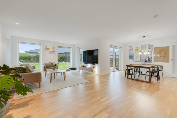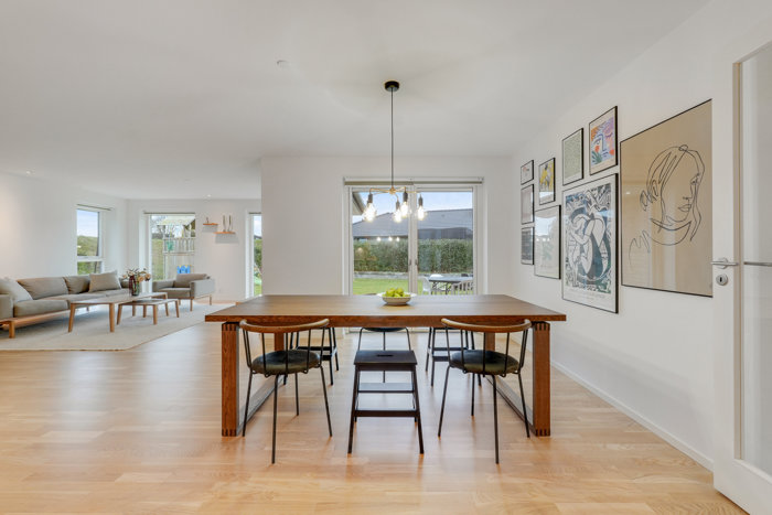 Et sammenhængende forløb favner køkken-alrummet og stuen, og ud over et bemærkelsesværdigt lysindfald er pladsen også værd at notere sig. For I kan sagtens invitere bedsteforældre til spisning, uden at det bliver trangt. Har nogen i familien tryktestet gummistøvlerne i samtlige vandpytter, er det desuden praktisk, at bryggerset ligger lige ved entréen, så de kan tørre ude af syne.