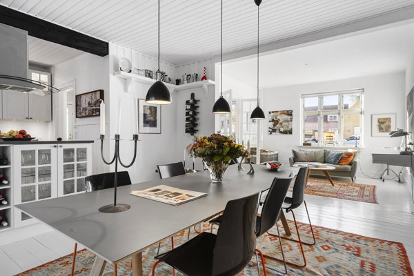 Den gode atmosfære føres videre i husets indre og i den fantastiske gårdhave, der har et sydeuropæisk præg. Boligen, som er den ene halvdel af et karakteristisk tvillingehus fra 1912, fremstår utroligt gennemført i sin stil – med et utal af flotte detaljer og finurlige kringelkroge, somman kun kan elske. Tag eksempelvis de smukke dørhåndtag og de originale plankegulve, som er malet i en fin, lysegrå farve, der matcher resten af husets fænomenalt fine og lyse look. Boligen rummer 160 kvadratmeter fordelt på to velindrettede etager, og dertil kommer en 16 kvadratmeter lækker vinkælder med værkstedsplads. Der er ovenikøbet indhentet tilbud på udnyttelsen af tagetagen, og vælger I denne løsning, får I yderligere tyve beboelige kvadratmeter og en om muligt endnu smukkere udsigt.