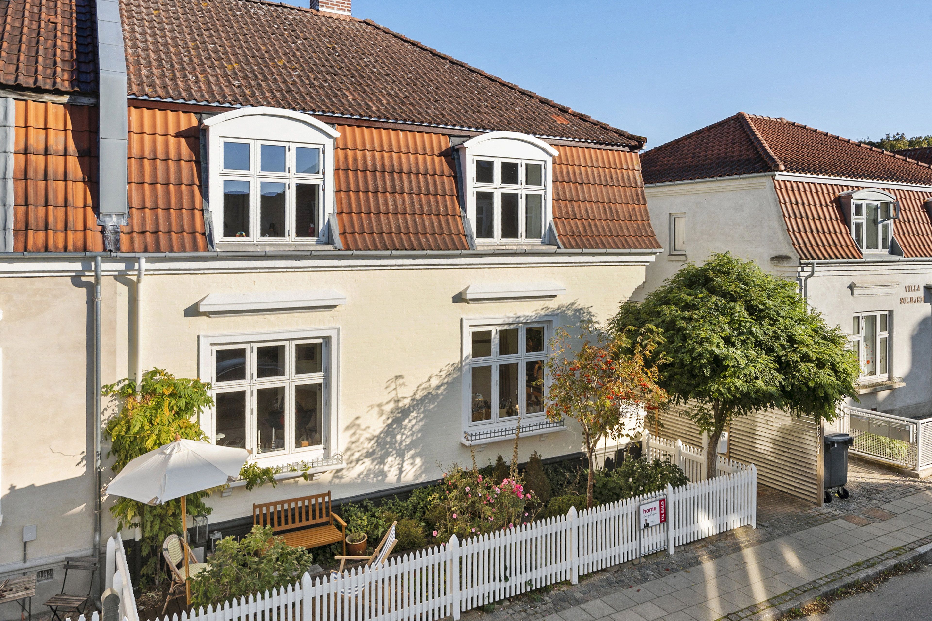 I den italiensk inspirerede gårdhave kan I sidde ugeneret på verandaen og nyde de forskellige planter, der blomstrer på skift. Græsslåning behøver I aldrig tænke på, og i forhaven, der vender stik syd, kan I sidde og nyde et lækkert glas vin og hilse på naboerne.