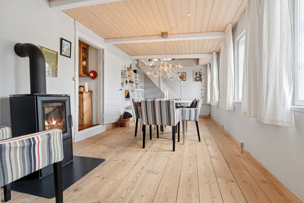 Side om side med køkkenet findes stuen, som har brændeovn. På førstesalen er der ligeledes brændeovn, og etagen udgøres af ét stort værelse. Her er højt til loftet og en fantastisk rumfornemmelse, der hjælpes yderligere på vej af den brede kvist. Denne har glaspartier med dobbeltdør ud til en fransk altan – og udsigten er virkelig betagende.