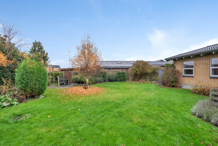 Den overskuelige have byder på hele tre terrasser, hvor I nyde udelivet, mens ungerne får en fin græsplæne at lege på. De kan også trygt lege ude på vejen, som er lukket. Der er også flere grønne områder i nærheden, og området forbindes af et omfattende net af stier. I kommer også nemt til skole, daginstitutioner og selv stationen kan nås til fods på et kvarter.