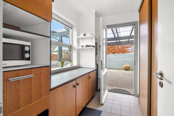 Der er tørskoet indgang til huset direkte fra carporten. På højre hånd føres I ind i det store opholdsmiljø med køkken, alrum og stue i åbent forløb. Et lyst og indbydende rum, som giver gode rammer for samvær og trivsel. Køkken og alrum er belagt med charmerende klinker i klassisk stil, og der er desuden en brændeovn i overgangen til stuen, så den kan varme hele rummet op. Som ekstra bonus er der også adgang til en udestue, som giver en dejlig forlængelse ud mod haven.