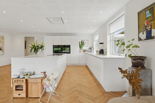 Indenfor åbner boligen sig med et stort og indbydende køkken-alrum, der uden tvivl bliver hjemmets naturlige samlingspunkt. De lyse overflader, gode materialer og generøse opholdsrum giver plads til både hverdag og gæster. Her kan man lave mad, mens samtalen flyder ved spisebordet, og børnene leger i den anden ende af rummet. Lyset strømmer ind fra flere sider og skaber en luftig og behagelig atmosfære dagen igennem.