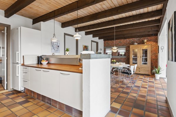 Husets hjerte er det store køkken-alrum, der er i åben forbindelse med en imponerende opholdsstue. Her er ovenlysvinduer, der lader dagslyset strømme ind og skaber en let og luftig atmosfære. Dette er rummet, hvor familien samles til hverdagens små og store øjeblikke, og hvor der er plads til både hyggelige middage og større selskaber. Fra køkkenet er der desuden udgang til en dejlig terrasse, hvor udelivet kan nydes i private omgivelser. Stuen er rummelig og hyggelig med direkte udgang til terrassen og haven. Den gennemgående loftskonstruktion med synlige bjælker tilfører både karakter og varme til boligen og skaber en rød tråd i indretningen.