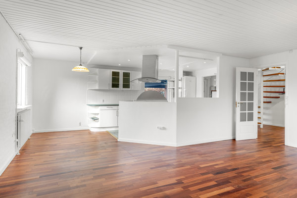 Boligen byder på en stor og rummelig entré, hvorfra du kan tilgå køkkenet, som ligger i åben forbindelse med stuen. Fra stuen har du ydermere adgang ud til ejendommens overdækket, sydvendte terrasse.