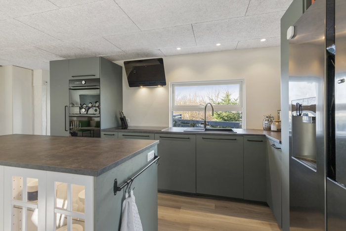 Køkkenet ligger i åben forbindelse med alrummet, så man er en del af det hele, uanset om man laver mad eller sidder ved bordet. Lige ved siden af ligger stuen – lidt mere tilbagetrukket og oplagt, når aftenen falder på, og man har brug for ro, dæmpet lys og en sofa, der inviterer til at blive siddende lidt længere.