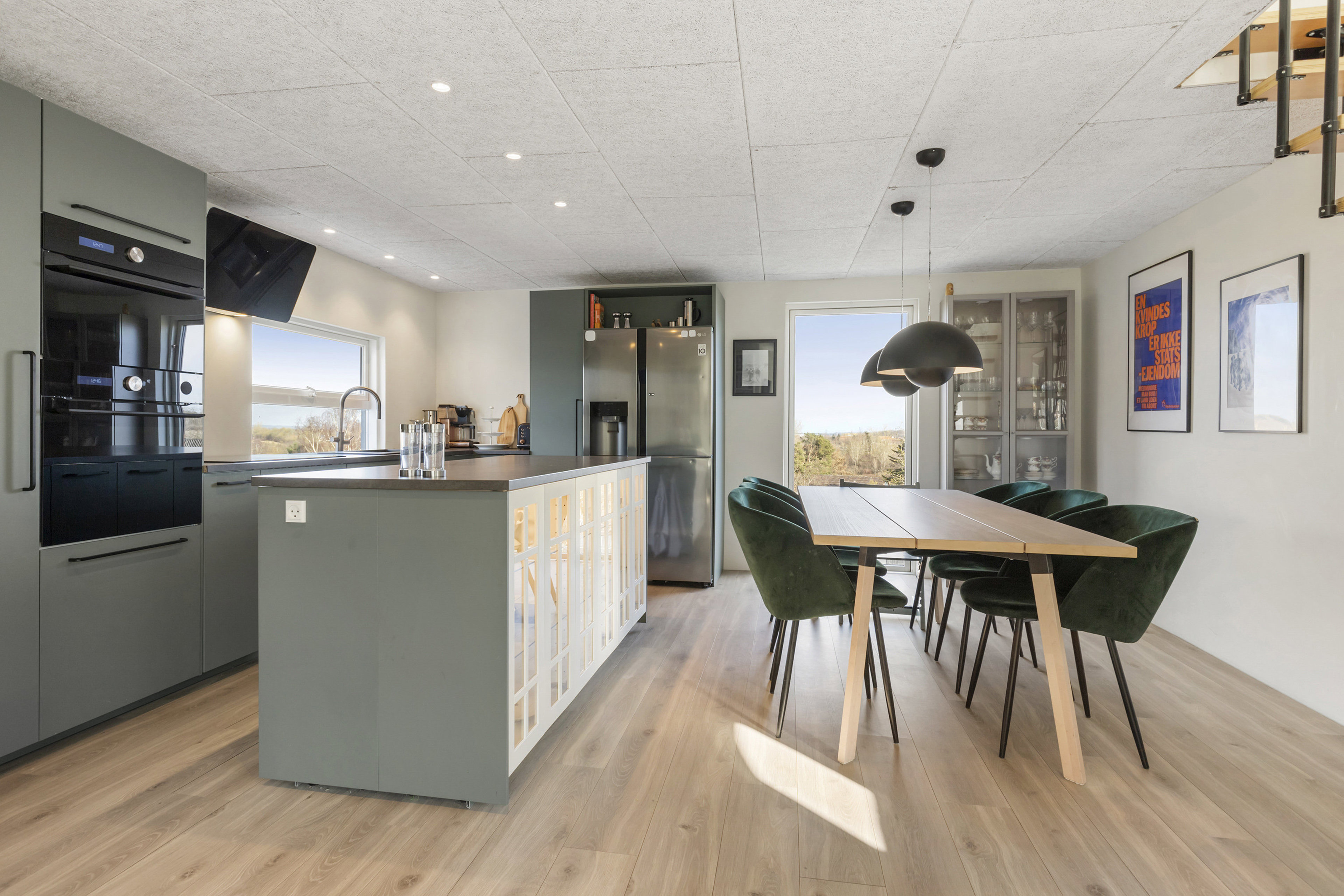 Du bliver budt velkommen i entréen, der ligger praktisk midt i huset og binder stueplanen fint sammen. Herfra åbner boligen sig mod det store køkken-alrum, som hurtigt bliver det naturlige samlingspunkt. Rummet er bredt og åbent, og lyset falder gavmildt ind langs facaden, mens blikket hele tiden bliver trukket ud mod udsigten. Det er den type rum, hvor man nemt forestiller sig en stille morgen med kaffe ved køkkenøen – og senere på dagen et langt spisebord fyldt med gæster og snak, der får lov at brede sig.