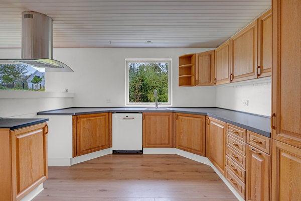Også indvendigt fremstår huset i pæn og velholdt stand, og indretningen er tidssvarende med køkken og stue samlet i et åbent rumforløb. Køkkenet er af ældre dato, men fremstår velholdt, og de solide træfronter er ikke uden charme. Foretrækker I mere moderne rammer, er det naturligvis et oplagt sted at opdatere. Rummet fungerer godt i samspil med alrummet, som har udgang til en terrasse mod vest. Helt perfekt i sommerhalvåret, hvor I nemt kan flytte aftensmåltidet ud under åben himmel.