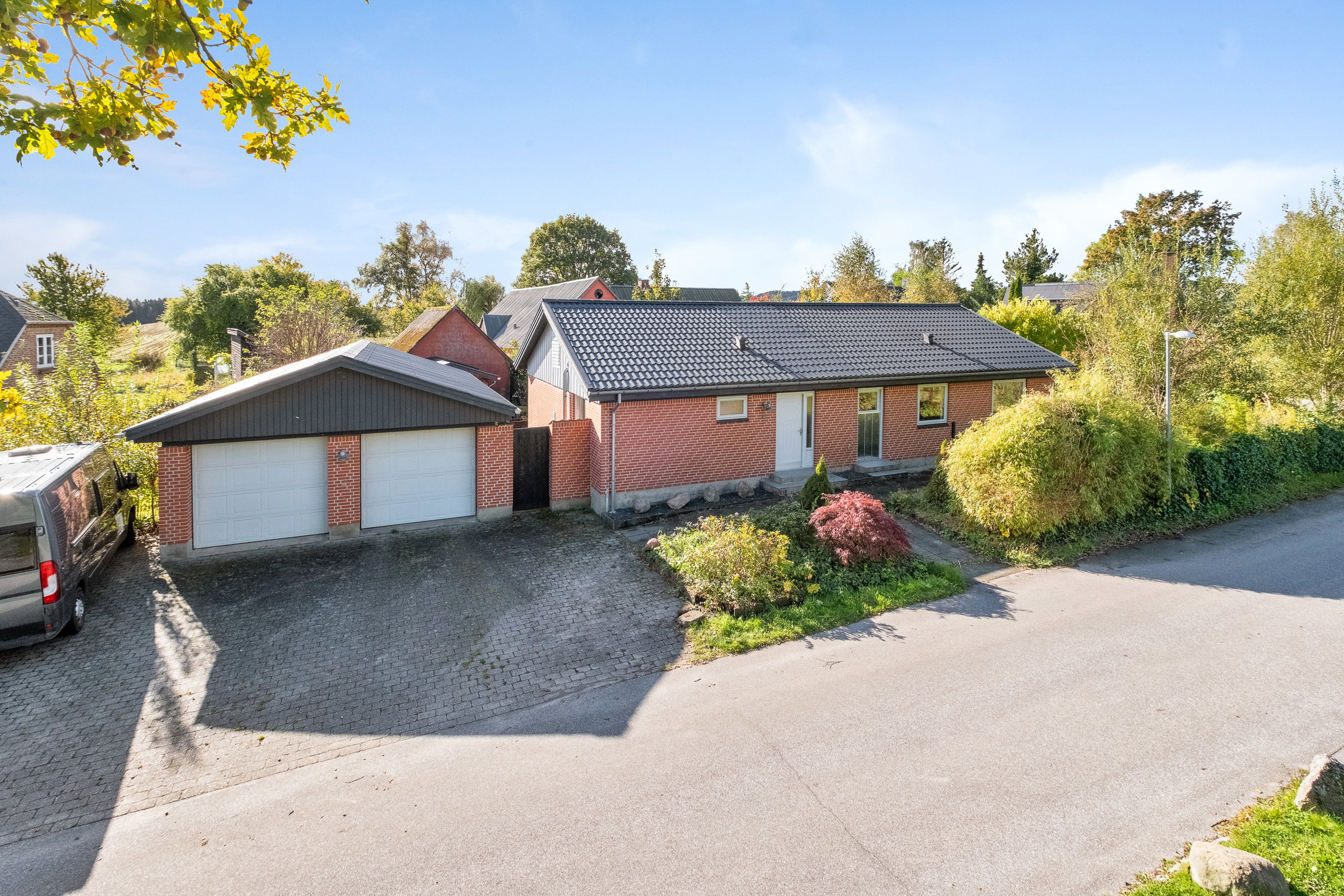 Det er ikke mindst den murede dobbeltgarage med to porte, der skiller denne etplansvilla i Alling lidt nord for Ry ud fra mængden. Hele ejendommen præsenterer sig med nydeligt murværk i røde sten, og I får 130 boligkvadratmeter samt 48 m2 i garagebygningen, som også har værksted. Alling er en hyggelig landsby, der ligger naturskønt nær skove, søer og åbner marker blot tre minutters kørsel fra Ry centrum - velkommen til!