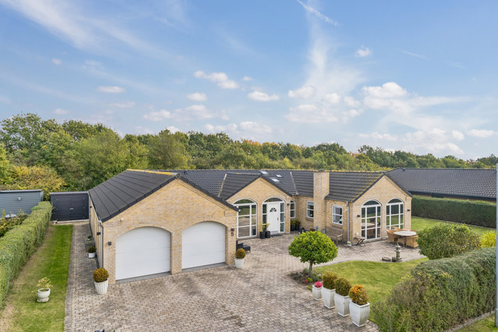 Her får I en fuldmuret villa fra 2007, opført af Lasse Larsen, med hele 199 m² bolig, trægulve fra 2023, en stor dobbeltgarage med elport og masser af plads til familien og gæster.