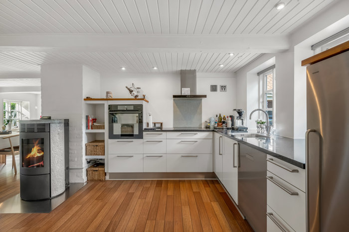 Indendørs får du 175 velfordelte kvadratmeter fordelt på to plan. I stueetagen møder du et lyst og moderne køkken med god skabsplads og alle nødvendige faciliteter. I åben forbindelse heraf ligger en hyggelig spiseafdeling – perfekt til hverdagsmiddage og samvær. Her er desuden et stort soveværelse og to gode værelser, som kan anvendes til både børn, kontor eller gæster. Badeværelset er moderne og funktionelt med gulvvarme, og i bryggerset er der direkte adgang til den integrerede garage samt et anvendeligt hobbyrum. Som ekstra komfortvarme findes en effektiv pillebrændeovn i stueplan, der skaber både hygge og varme på kolde dage.