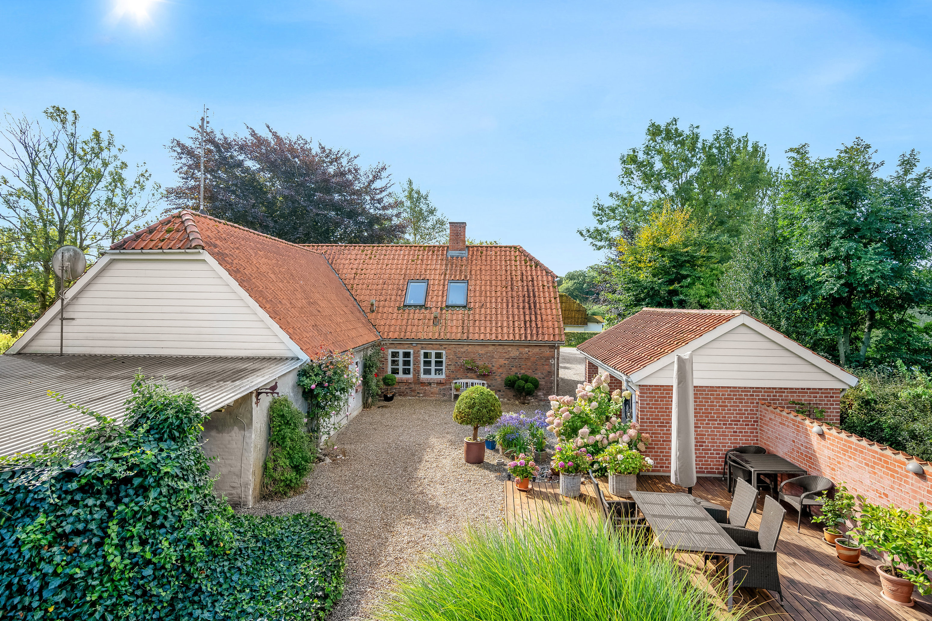 Ejendommen er opført helt tilbage i 1780 og står i dag flot og velholdt med respekt for de oprindelige detaljer. Facaden er opført i smukke munkesten, og huset prydes af klassiske trævinduer samt et solidt tegltag fra 1992. Grunden er på hele 1.832 kvm og byder på grønne arealer, hyggelige kroge og rig mulighed for både leg, afslapning og haveliv. Drømmer du om egne køkkenurter, blomsterbede eller blot en rolig oase med fuglesang og frisk luft, er rammerne helt perfekte.
