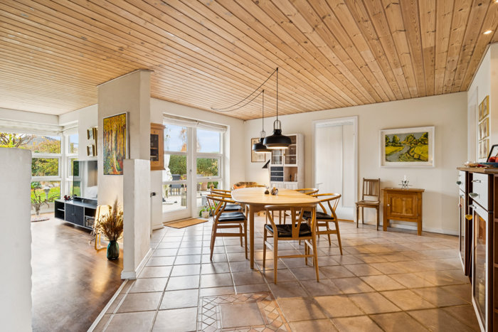 Husets hjerte er det store køkken/alrum, hvor Svane-køkkenet fremstår funktionelt med masser af bord- og skabsplads samt gaskomfur via naturgas. Her er der god plads til familiens fælles måltider, og fra alrummet er der åben forbindelse til opholdsstuen, som indbyder til afslappede timer med udsigt over den smukke, ugenerede have. Overalt i de klinkebelagte rum er der behagelig gulvvarme, som giver en rar varme og et lavt vedligeholdelsesniveau året rundt.