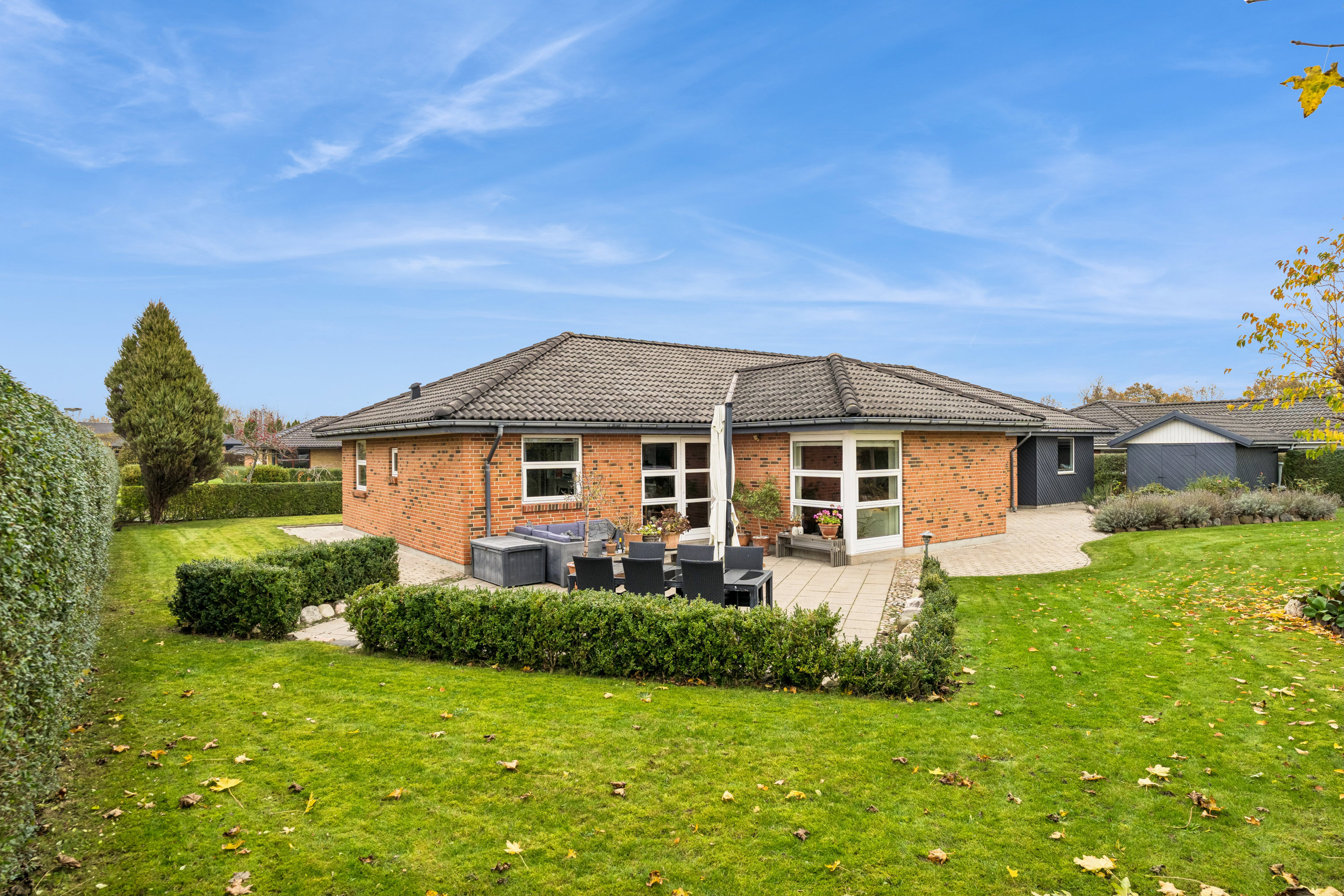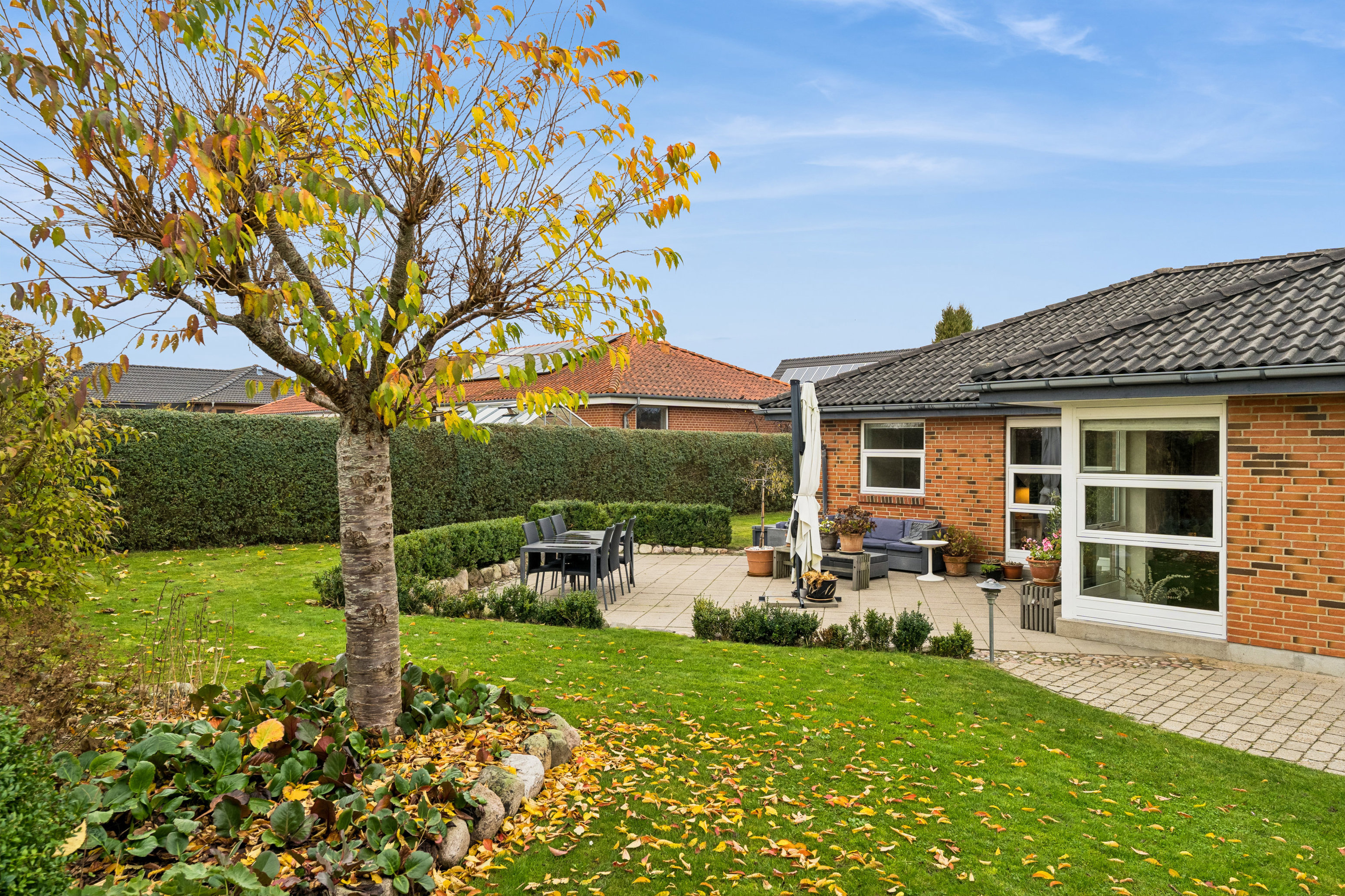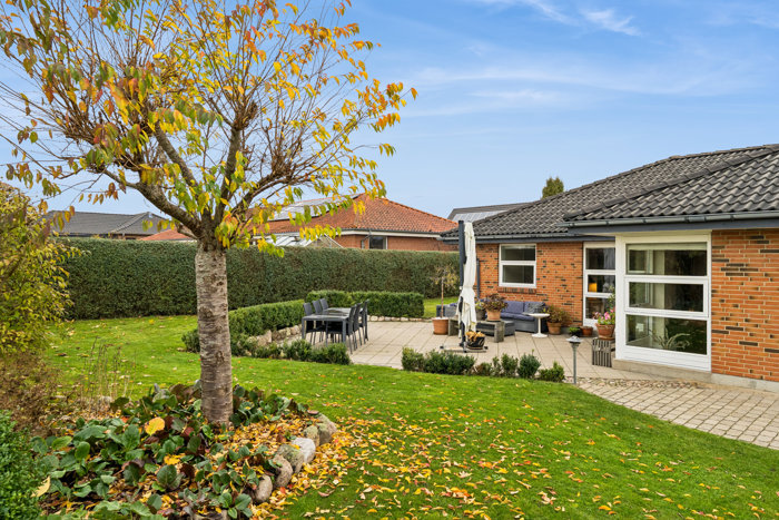 Den 919 m² store grund er anlagt med tanke på minimal pleje. Haven ligger fuldstændig ugeneret og er smukt anlagt med grønne bede, der kun kræver opmærksomhed én gang om året. Her kan du nyde privatlivet på terrassen, mens børnene leger på plænen, eller du blot trækker dig tilbage i fred og ro efter en travl dag.