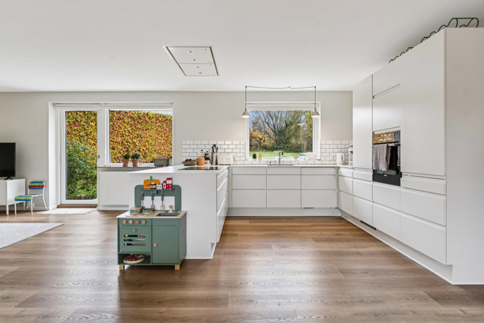 For enden af gangen åbner hjemmet sig op i et stort, lyst alrum med lækkert HTH-køkken med hvide, grebsfrie fronter i åben forbindelse til spise- og opholdsområde. Her er god plads til både gæster og familiehygge, og fra alrummet er der udgang til to solrige træterrasser på hver side af huset – perfekt til udelivet hele dagen. Via alrummet er der desuden adgang til en privat forældreafdeling med et stort soveværelse.