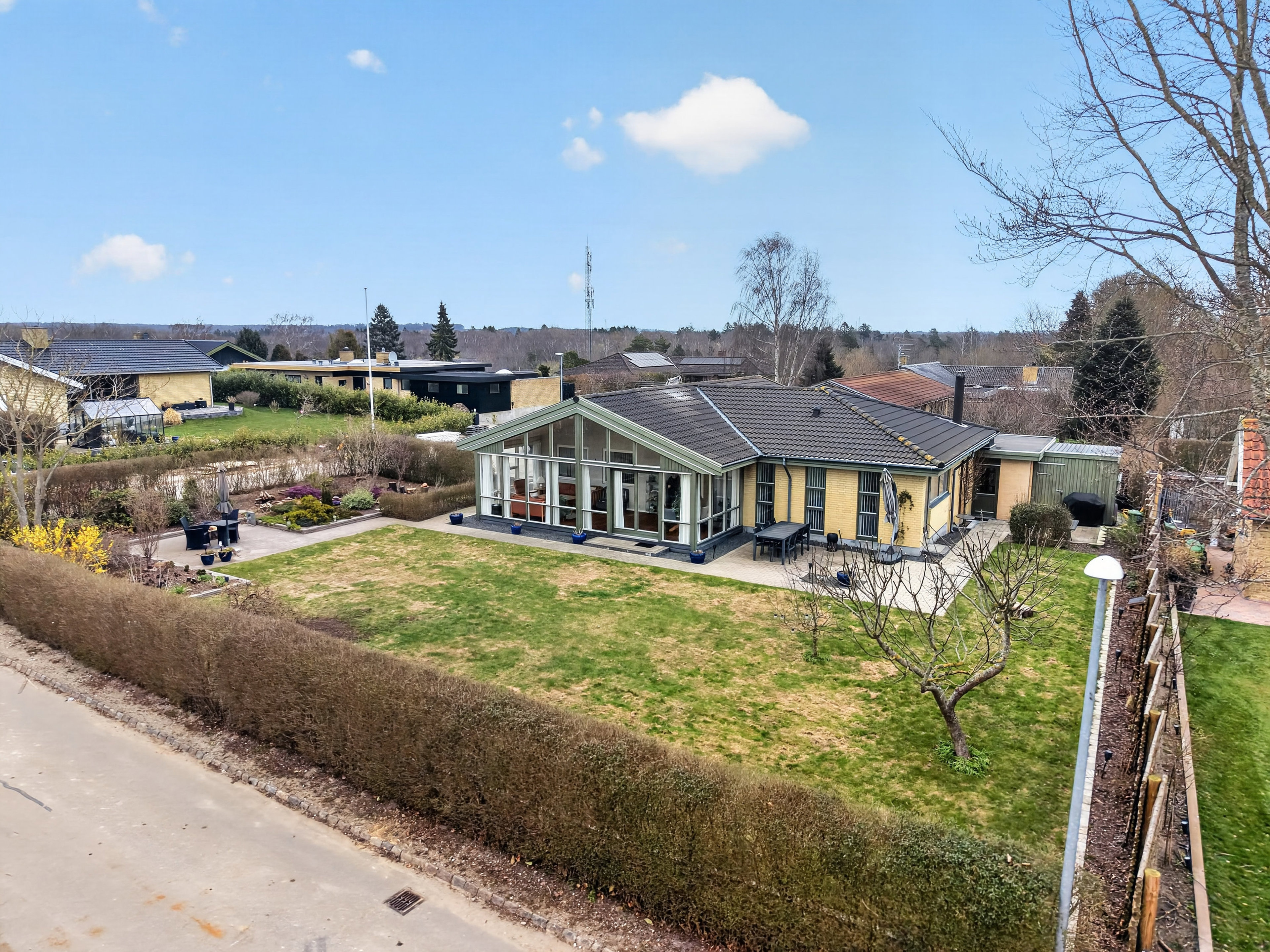 På den tilhørende grund er den moderne villahaves overskuelighed krydret med farverne fra den klassiske prestigehave. Bedene er så store og varierede, at de nærmest indeholder en regulær samling af blomster, mens buske og rododendron skaber farver i højden. I øvrigt har man dækket bedene med flis, som holder ukrudtet nede, og I får selvfølgelig plads til at dase på de skønne, solvendte terrasser.