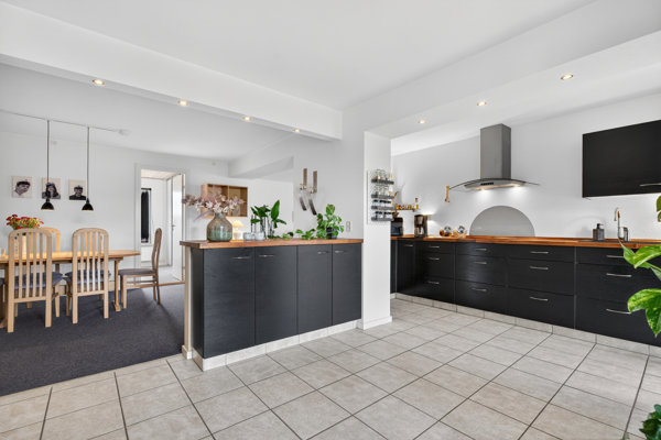 Inden døre har villaen for længst lagt 60’erne bag sig, så I stedet møder I masser af moderne, velvalgte opdateringer på tværs af de 146 boligkvadratmeter. Allermest tydeligt bliver det i opholdsafdelingen, der samler køkken, stue og spisestue i åbent rumforløb. Flere steder har man indbygget små serier af spots med god effekt, mens flotte træbordplader topper det sorte køkkeninventar, der således matcher den hyggelige pejseindsats i stuen.