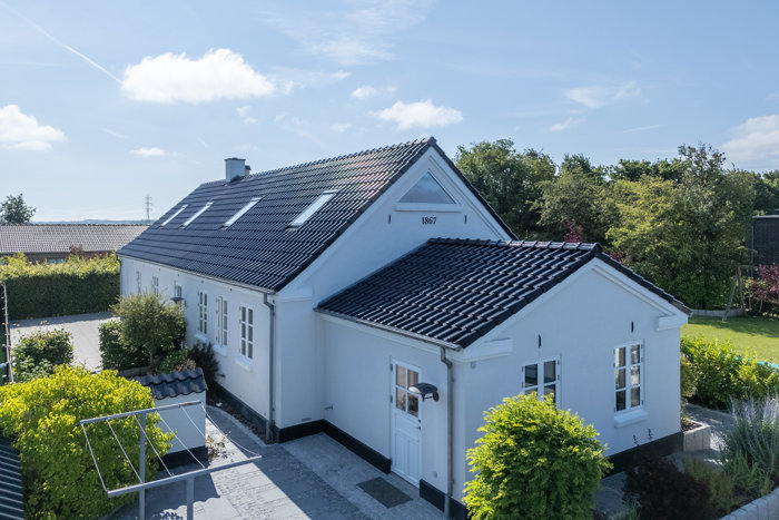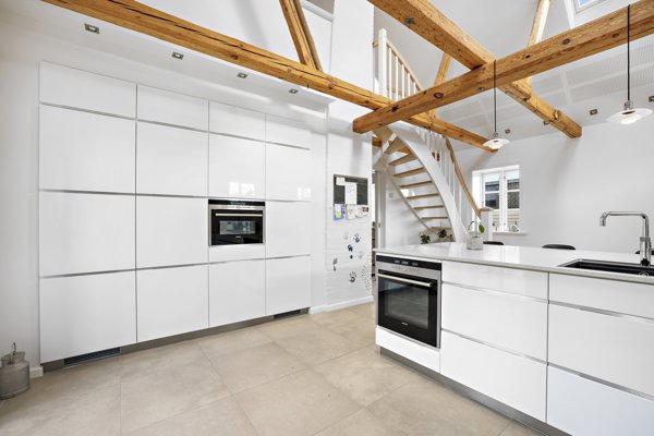 Indretningen byder på mange spændende, arkitektoniske detaljer. De hele 253 kvadratmeter er fordelt på en rummelig, klinkebelagt entré med gulvvarme som i den øvrige bolig. Et funktionelt bryggers med teknik og god opbevaringsplads sætter rammen. Et stort aktivitetsrum/stue med synlige bjælker og brede lamelplankegulve inviterer til samvær og hygge. To lyse børneværelser. Et luksuriøst badeværelse med nedsænket badekar og elegant bruseniche. Boligens samlingspunkt er det imponerende køkken/alrum med loft til kip, fritlagte bjælker og hvide elementer, der fremhæver husets sjæl. Herfra er der direkte udgang til haven via glasdør – perfekt til livet med åbne døre om sommeren. 1. salen byder på en charmerende og meget stor opholdsstue, ekstra badeværelse samt et stemningsfuldt soveværelse helt roligt under tagets skrå vinkler. Overalt i boligen opleves et usædvanligt flot lysindfald og en atmosfære, der kun findes i ejendomme med historie og kant.
