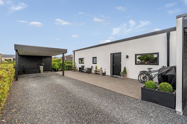 Udendørs får du en nem og privat have, der indbyder til leg og afslapning. Her er også en carport med integreret redskabsrum samt god plads til cykler og opbevaring.