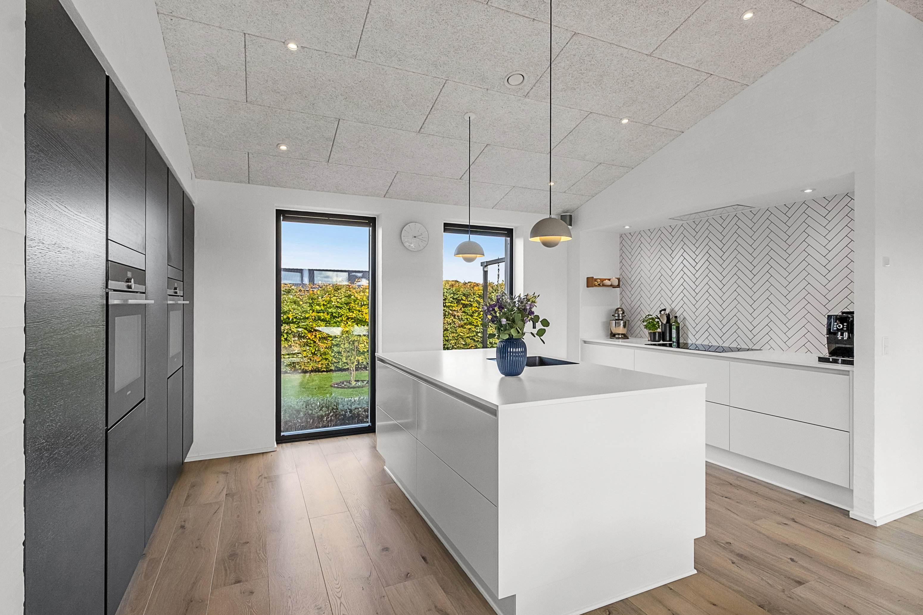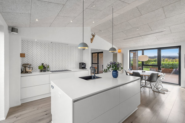 Boligen er opført i ét plan og rummer hele 164 m² fordelt på fire gode soveværelser, to badeværelser og et stort opholdsrum, der samler køkken, alrum og stue i ét. Her er plads til både familieliv og gæster, og de store vinduespartier trækker lyset helt ind i hjertet af hjemmet. Overalt er der valgt lækre og kvalitetsbevidste materialer, og den gennemførte stil skaber en varm og harmonisk helhed.