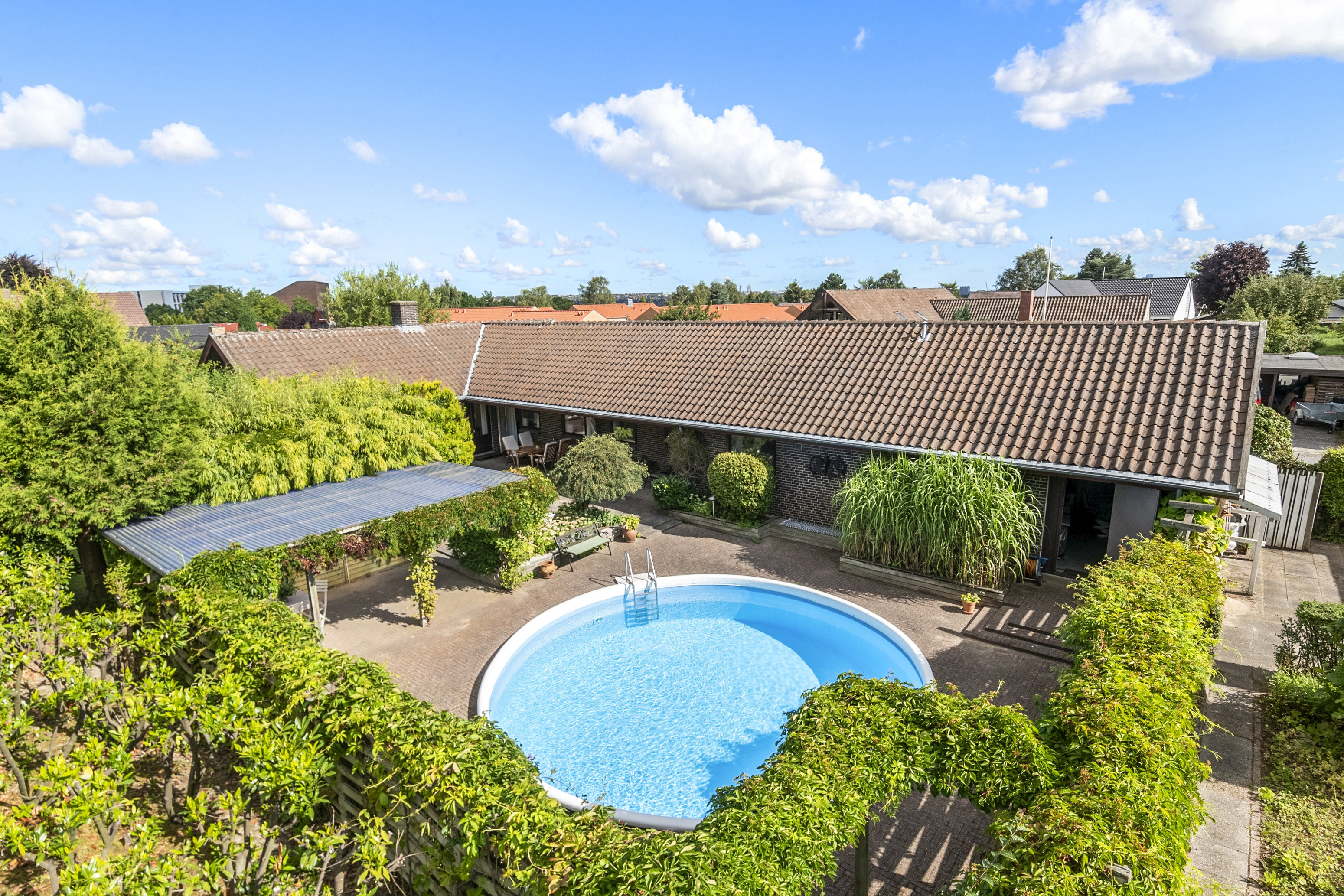 Husets helt fantastiske samlested i de varme måneder er den lukkede terrasse bag huset, hvor du helt ugenert kan nyde timerne foran eller i poolen. Et helt unikt området der giver lyst til leg og afslapning.