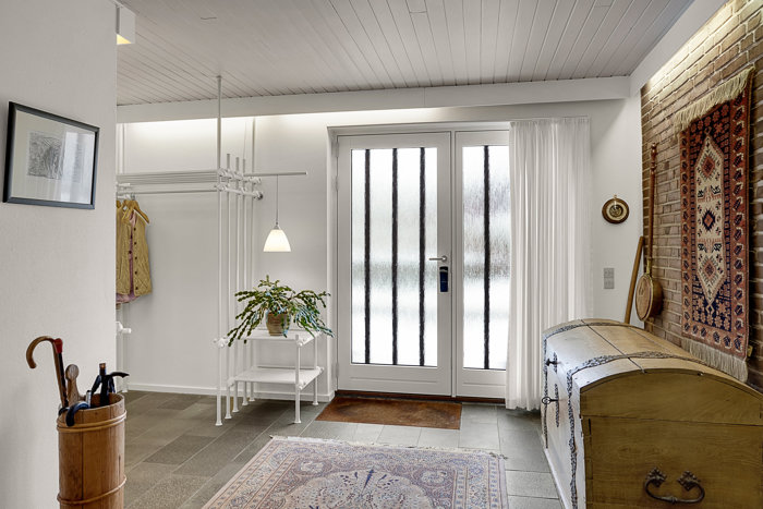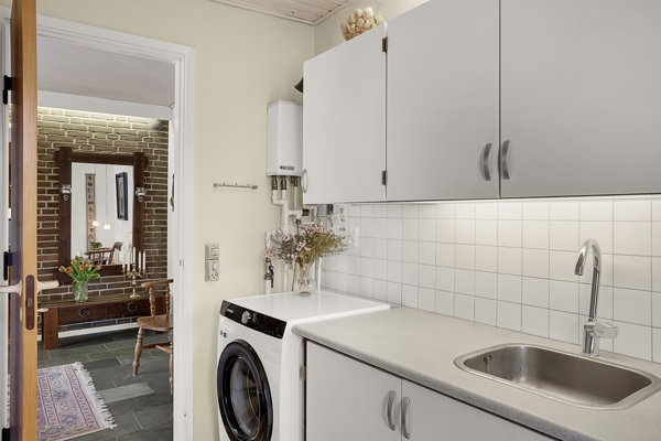 Du bydes velkommen i den store entre der rummer badeværelse og fint bryggers med vaskefaciliteter.