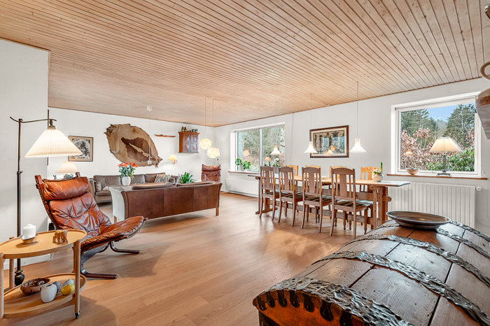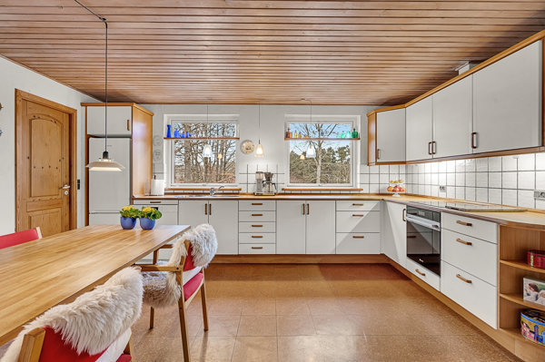 Der er god plads til samvær i den store, lyse stue i forbindelse med et funktionelt spisekøkken. Det er muligt at åbne op mellem køkken og stue for ét stort, flydende opholdsområde med brændeovn og direkte udgang til en stik sydvendt fliseterrasse.