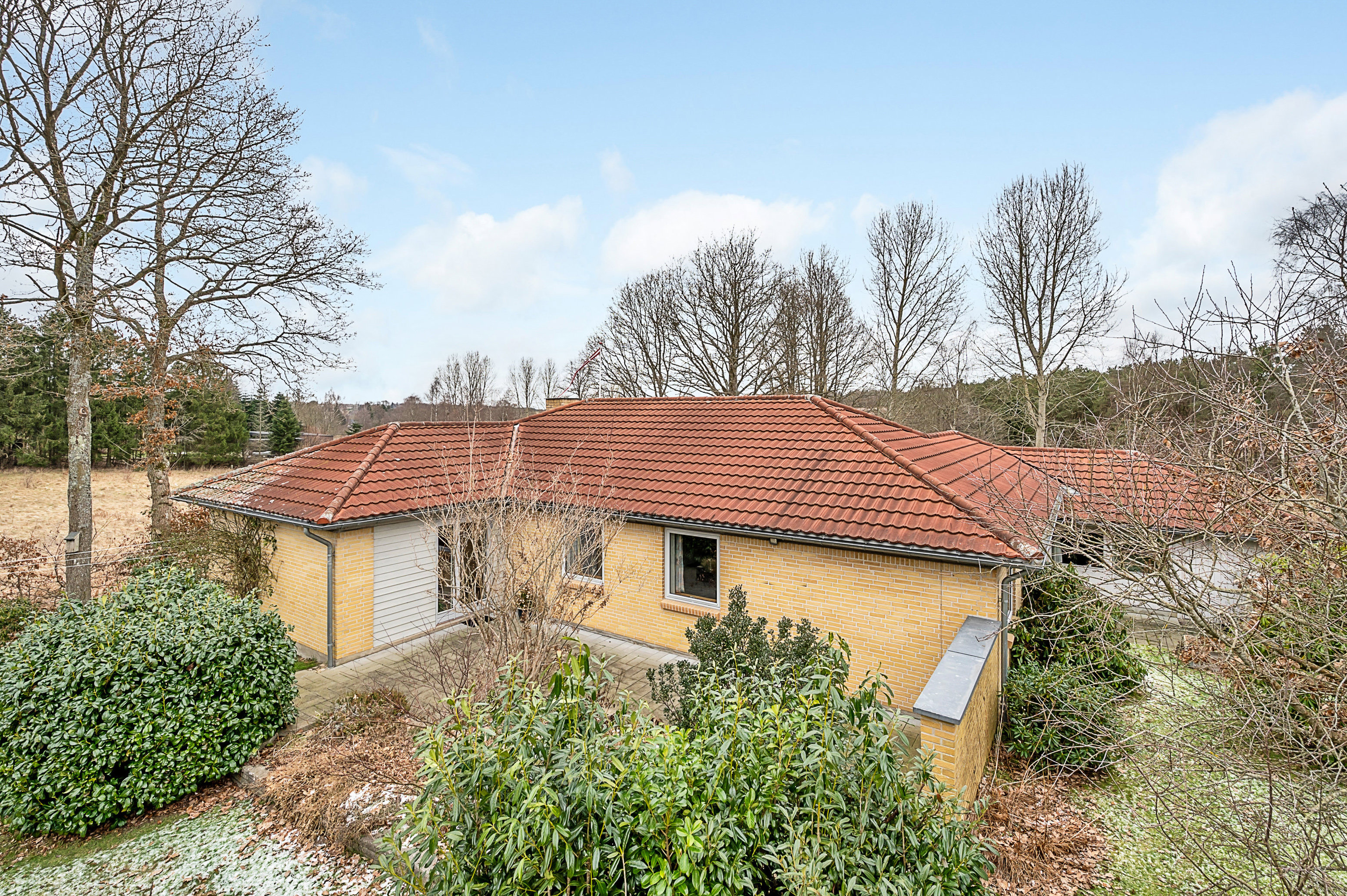 Huset ligger således lige op til mark og skov mod vest, hvor rådyr, harer, fasaner og talrige fuglearter dagligt kigger forbi, og alligevel er der kort gåafstand til Linås mange faciliteter.