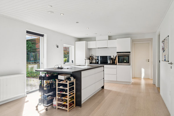 Køkkenet er moderne, funktionelt og indbydende – et naturligt samlingspunkt for hverdagen. Det åbne opholdsmiljø giver mulighed for nem forbindelse mellem stue og køkken, og fra opholdsrummet er der adgang til haven, som indbyder til afslapning og udeliv. Badeværelset står ligeledes skarpt med moderne elementer og tidløst design. De tre værelser giver fleksibilitet – her kan du indrette både børneværelser, kontor eller gæsteværelse alt efter behov.