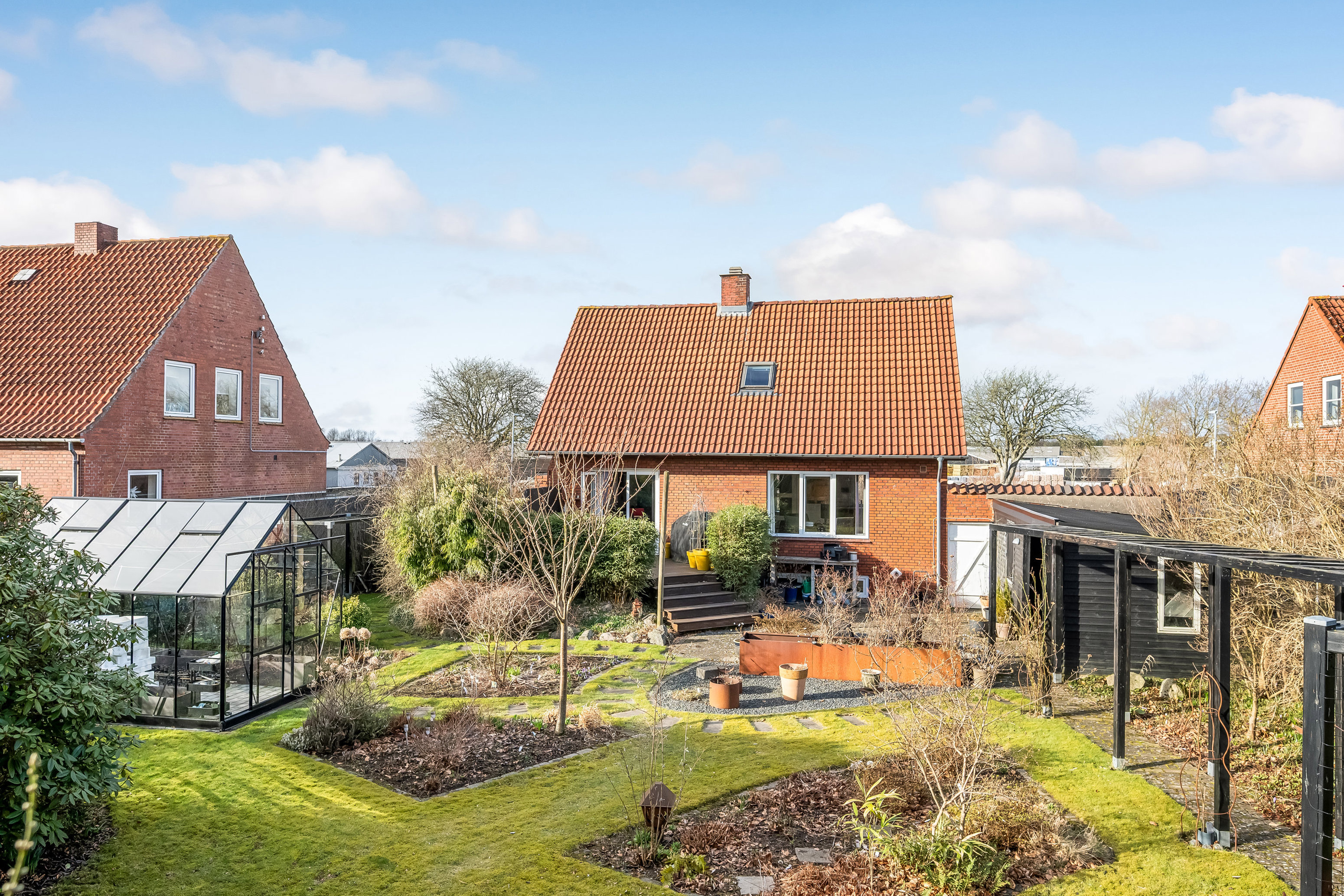 Udendørs får du en lukket have, der er nem at holde og samtidig indbyder til udeliv. Haven har en god størrelse og giver mulighed for både leg, afslapning og små haveprojekter. Foran huset er der en pæn indkørsel samt carport, så parkering er let og bekvemt.