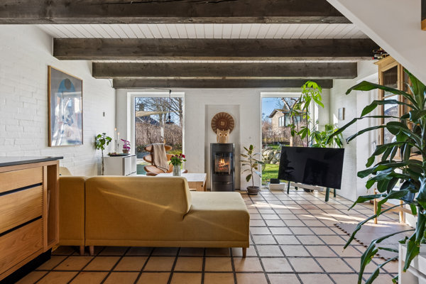 Huset er bygget i 1977, opført i mursten. Indenfor venter jer et charmerende og hyggeligt hjem, hvor det er nemt at føle sig godt tilpas. På øverste etage har I to fine værelser med skråvægge, hvor I kan indrette soveværelse i det ene og plads til kontor, krearum eller børneværelse i det andet. I stueplan har I et badeværelse og en entré med vaskesøjle samt køkken og stue i ét. Det stilrene køkken er tydeligt godt håndværk, foroven pynter tykke, blotlagte bjælker, og i stuen spreder en brændeovn varme og hygge. I køkkenet er der plads til spisebordet, i stuen til hjørnesofaen, og høje vinduespartier åbner op mod lyset og haven.