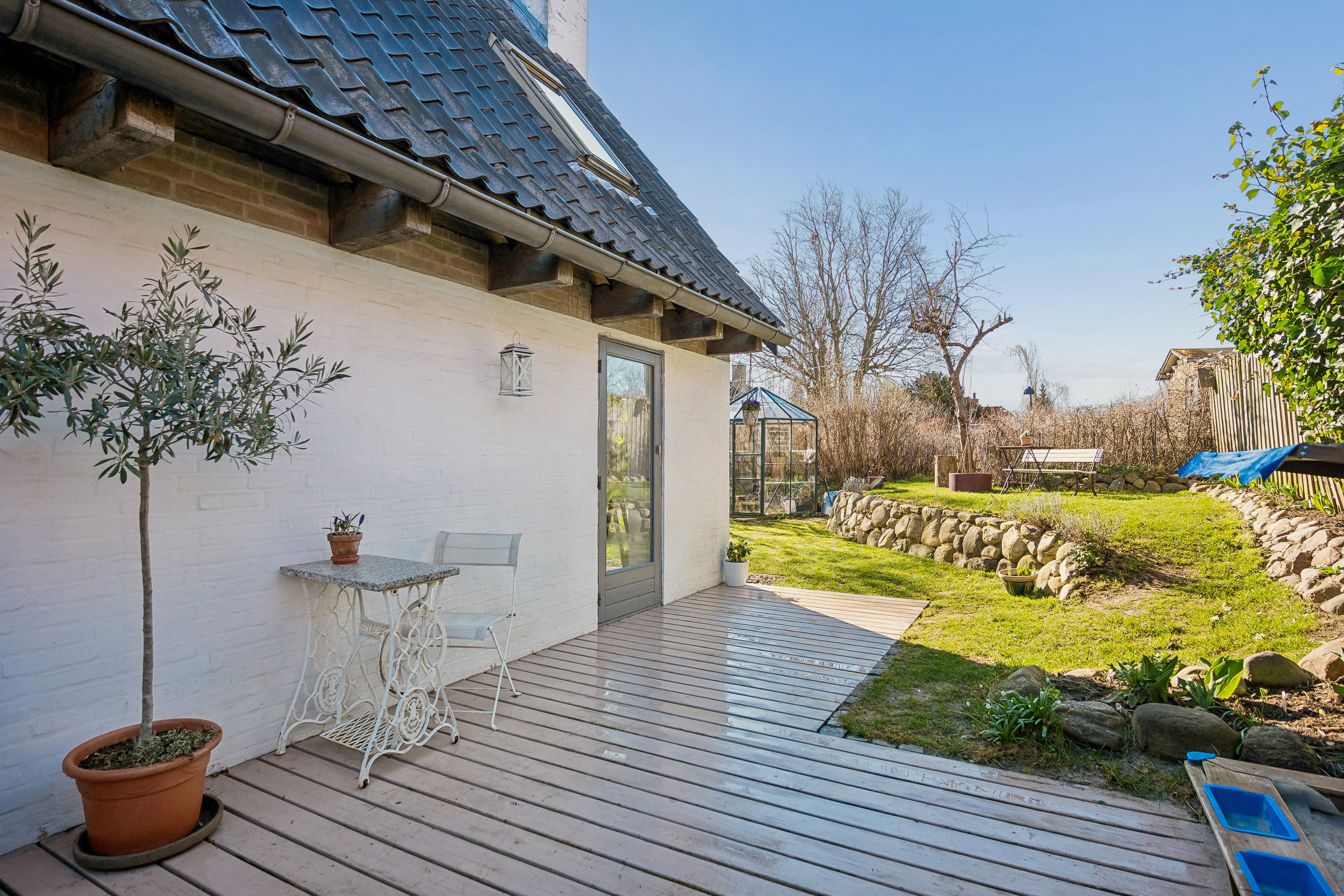 Fra stue kan I træde direkte ud i haven, som er en ren fornøjelse. Solretningen er mod syd, så I kan følge solens gang fra tidlig morgen til sen aften. I haven er der nemlig tre terrasser, vendt mod syd, øst og vest, så I kan altid finde en plet i sol eller skygge. Jer med grønne fingre får desuden rig mulighed for at udfolde jer, hvis I ønsker tomater i drivhus eller masser af farverige blomsterkrukker. Samtidig er man tilbagetrukket fra vejen, så den rolige stemning og følelse af grønt udenfor virkelig kan fornemmes både inde og udefra.