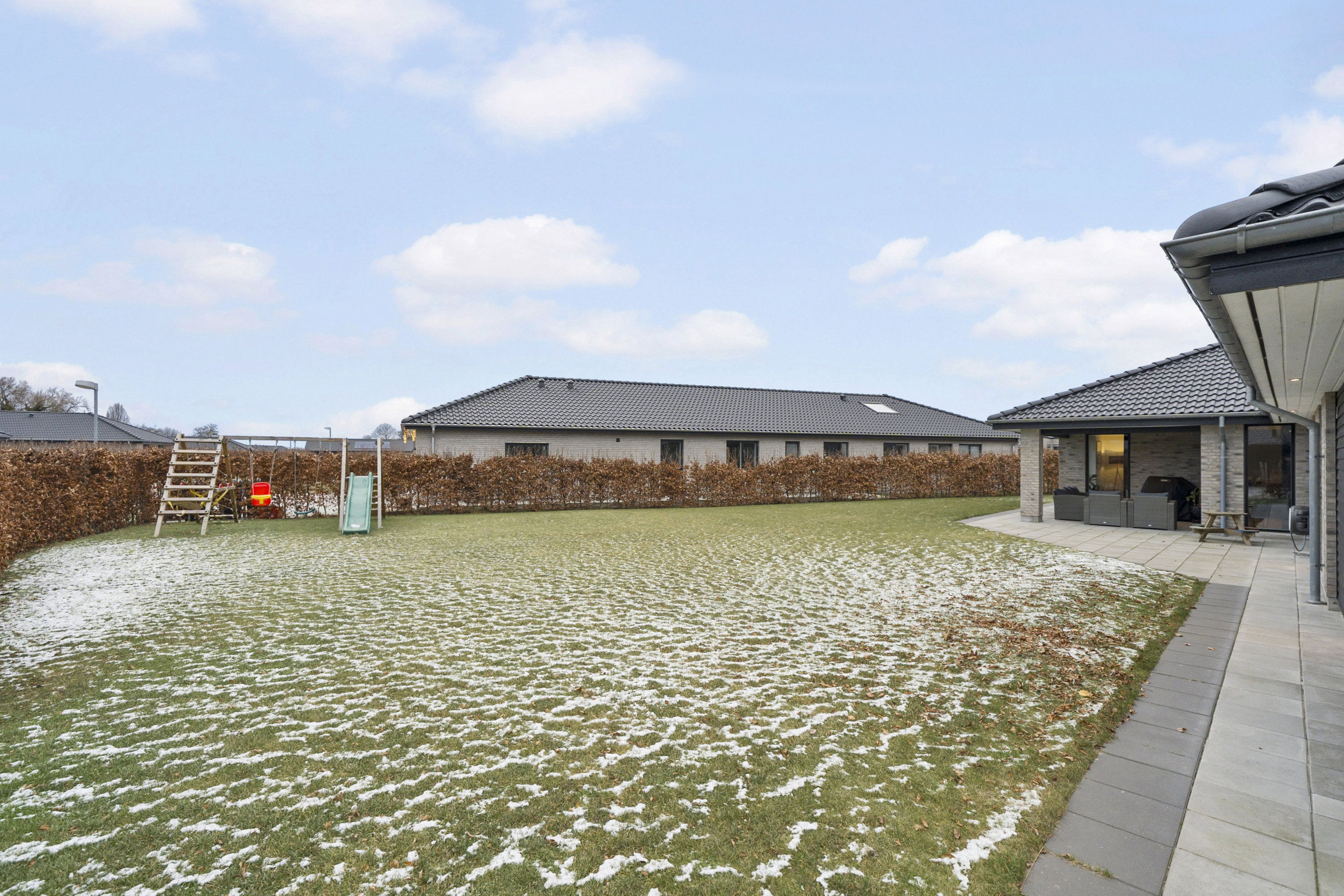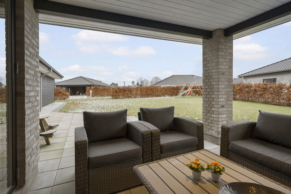 Hele herligheden er beliggende på en let anlagt grund. Fra alrummet er der adgang til en skøn, overdækket terrasse, som forlænger sæsonen og gør det muligt let at lade inde- og udemiljøerne smelte sammen. Der er flisebelægningen hele vejen rundt om huset, der sikre let adgang til de forskellige områder, den integrerede carport samt udhuset på 10m².