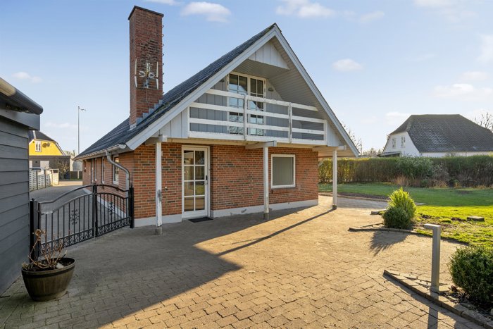 Udenfor kan bilen parkeres enten i den rummelige garage eller i indkørslen. Garagebygningen er stor, velholdt og udstyret med elektrisk port, hvilket gør den både praktisk og indbydende – perfekt til værksted, opbevaring eller hobbybrug.