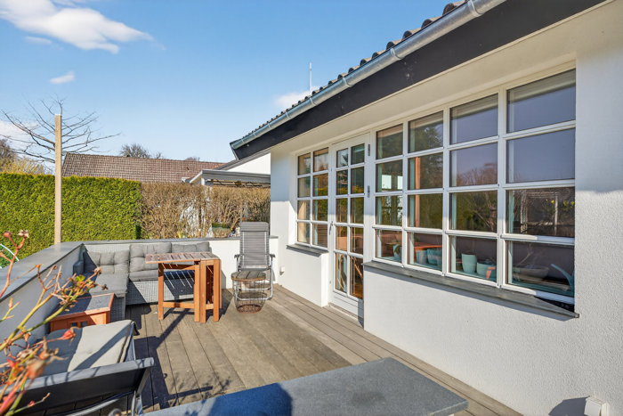 Udefra får husets klassiske gasbeton et moderne, hvidpudset udtryk med sprossevinduer og mørkt tegltag. På taget ligger 6 kW solceller, og sammen med boligens solvarmeanlæg giver det en energioptimeret ramme, der er let at holde af – ikke mindst fordi det hele er elegant udført uden at være højrøstet.