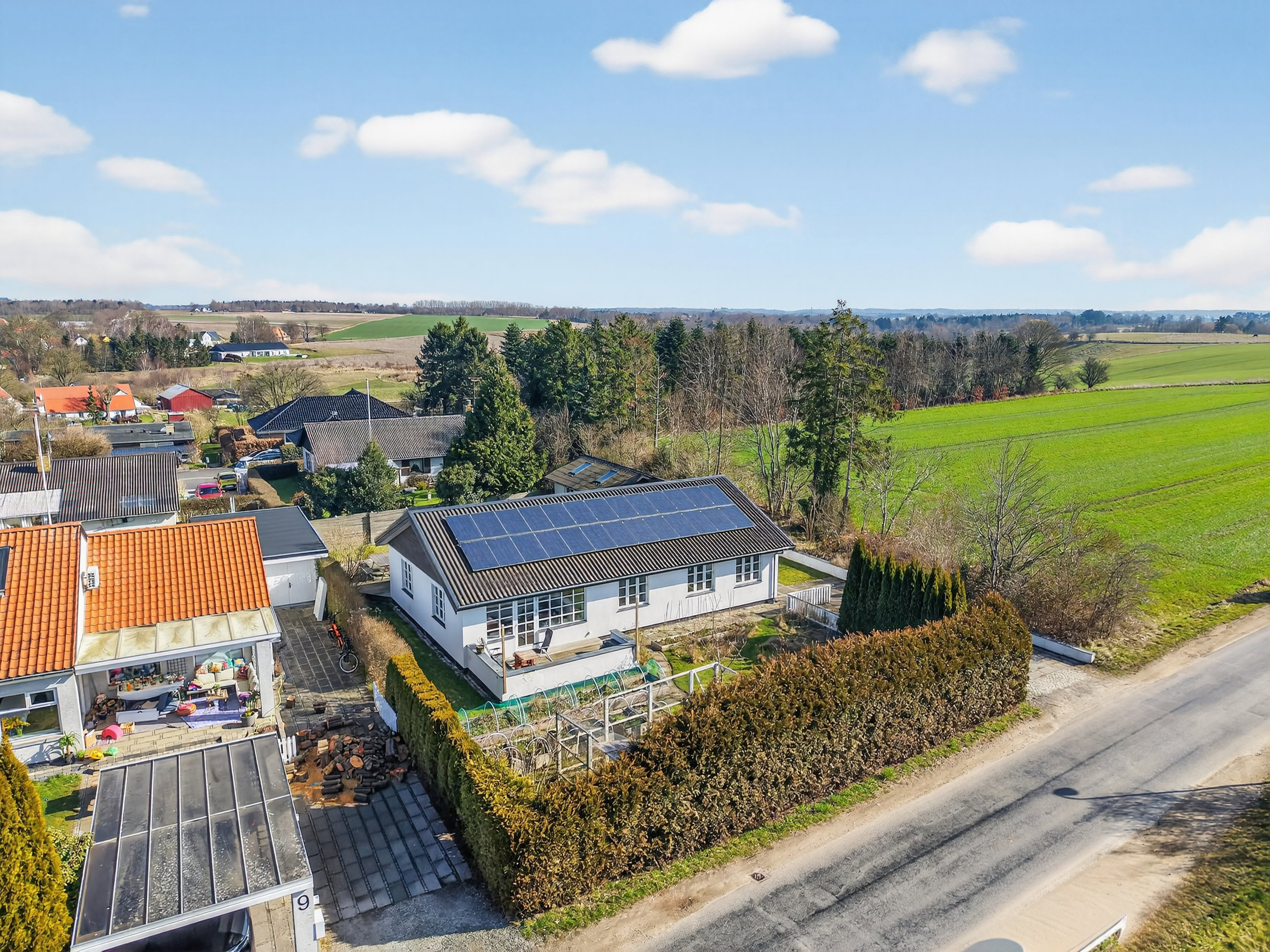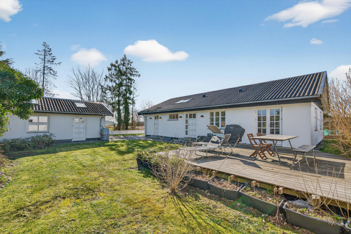 I skellet mellem landsby og landskab opstår en ro, som gør det hele lidt mere charmerende. Og netop dér ligger denne indflytningsklare etplansvilla fra 1965 – moderniseret i sit udtryk, badet i lys fra store vinduespartier og ovenlys, mens udsigten til de åbne marker ligger som et skønt, grønt bagtæppe bag den velholdte helhed.