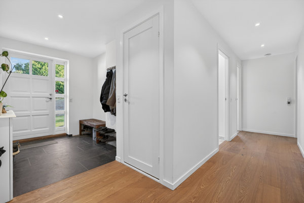 Lidt ekstra finesse ligger i badeværelset, hvor ovenlyset giver rummets flader et mildt dagslys, og hvor både badekar og bruseniche er på plads. Dertil kommer et stilrent gæstetoilet samt et bryggers, der også fremstår som et flot vådrum med plads til vaskefaciliteter. Værelsesafdelingen rummer to værelser, hvoraf det ene har walk-in-closet.