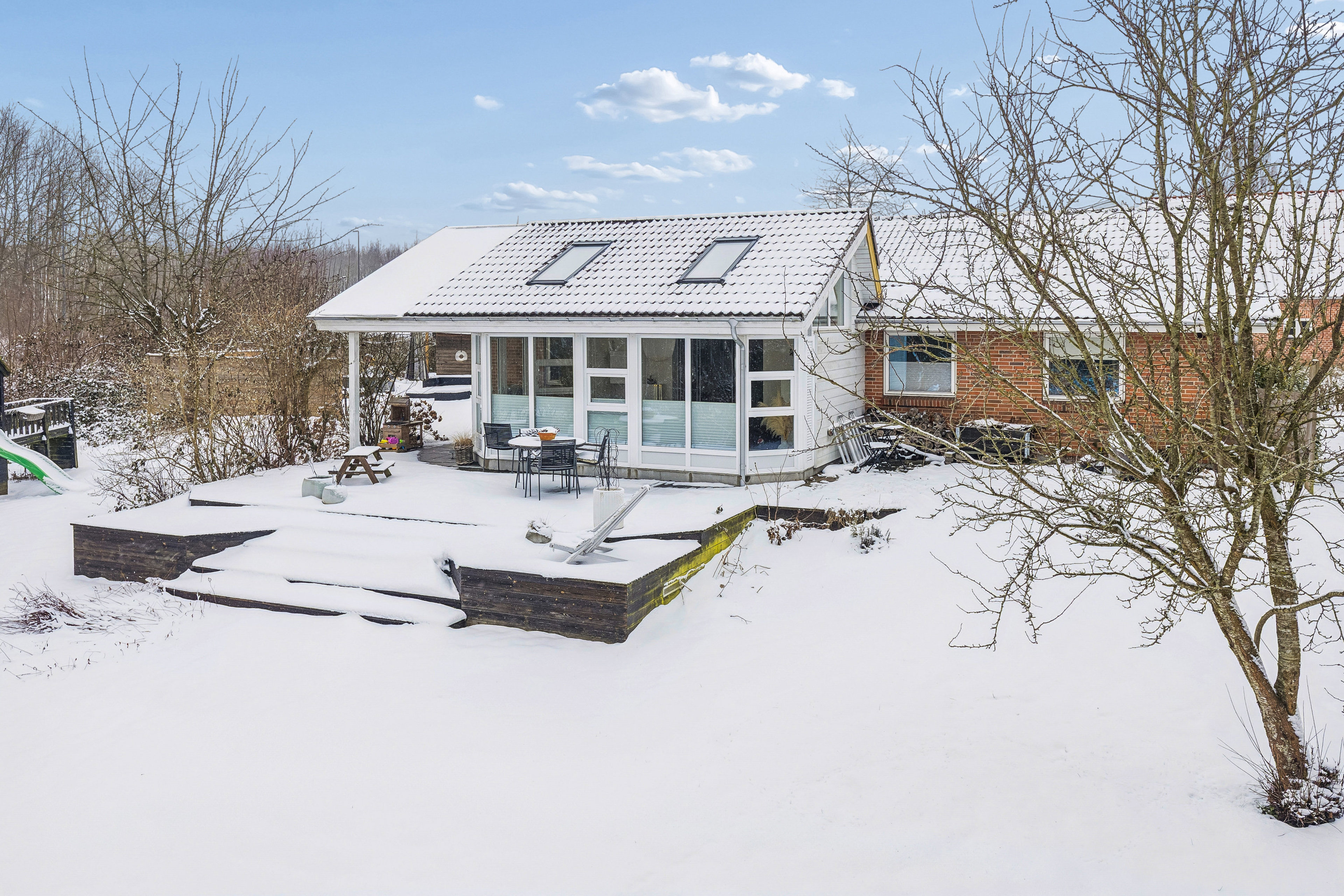 Udendørs venter nogle helt fantastiske rammer. Her får du en skøn, solrig solgård samt en sydvendt træterrasse, som virkelig kommer til sin ret i sommerhalvåret. Haven og terrassemiljøet indbyder til afslapning, grill og lange sommeraftener. Samtidig er der nem og direkte adgang til Hannerup Skov, som ligger lige overfor – ideelt til gå- og løbeture samt naturoplevelser året rundt.