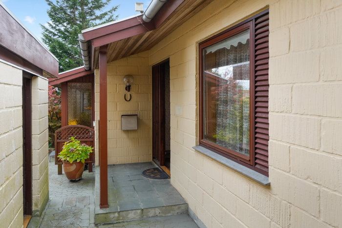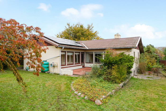 Villaen fra 1960 er sidenhen ombygget i 1974, og med undtagelse af solcellerne fra 2017 er huset ikke overbelastet af moderniseringer i mellemtiden. Dét skal dog ikke forveksles med boligens stand, for villaen er velholdt. Det betyder også, at I sagtens kan holde fast i nogle af de originale detaljer, hvis I vil. Klassiske indbygningsskabe, mønstrede parketgulve eller farverige klinker kan alt sammen få nyt liv i en moderne konstellation, men hvor meget – eller hvor lidt – er selvfølgelig helt op til jer. I får 155 m2 bolig foruden en god kælder på 55 m2, som er udstyret med et vaskerum og et værksted samt en stor, hyggelig gildesal med synlige loftsbjælker.