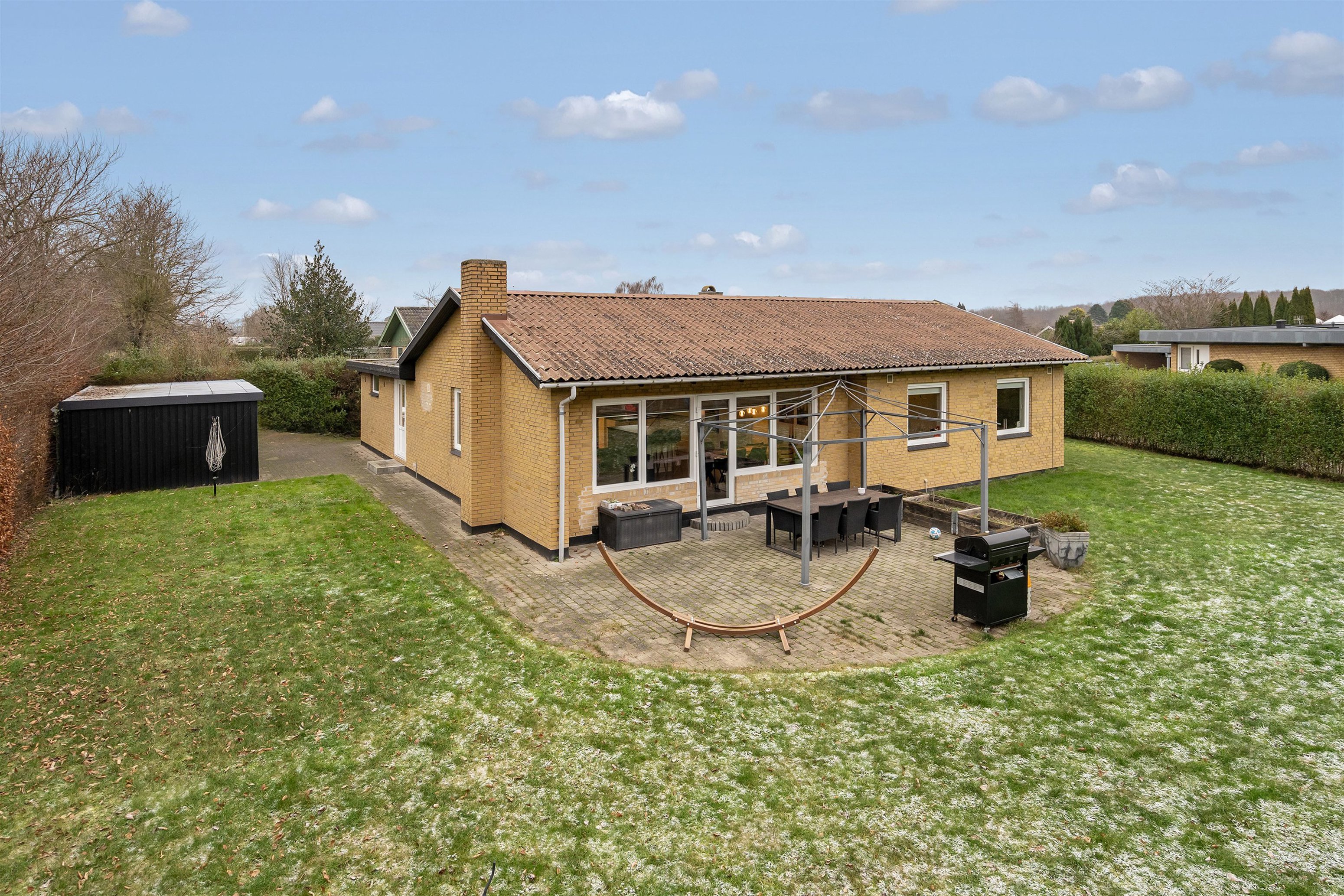 Grunden er på 927 m² og er nemt anlagt, så der er god plads til både leg, boldspil og hyggelige kroge, uden at haven kræver alt for meget vedligeholdelse.