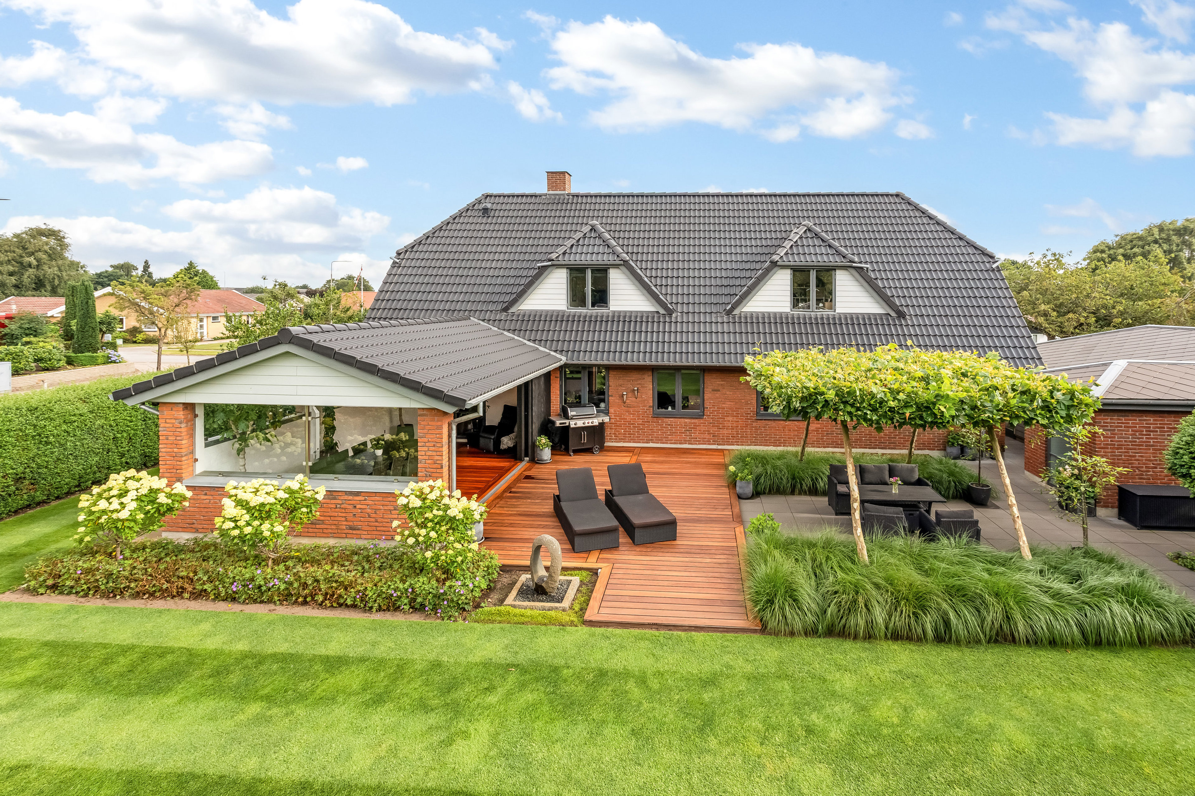 Ejendommens haveanlæg er noget helt for sig. Her er tale om en arkitekttegnet have med smuk beplantning, stor terrasse i hårdtræ og flere gode opholdsområder.