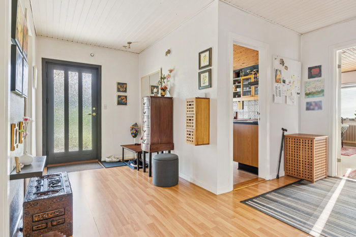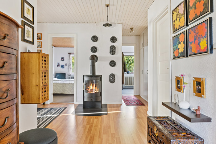 Du bliver budt velkommen af en rummelig entré som fungerer som fordelingsgang, med adgang til boligens hjerte – en hyggelig opholdsstue med god rummelighed og udgang til udestuen.
